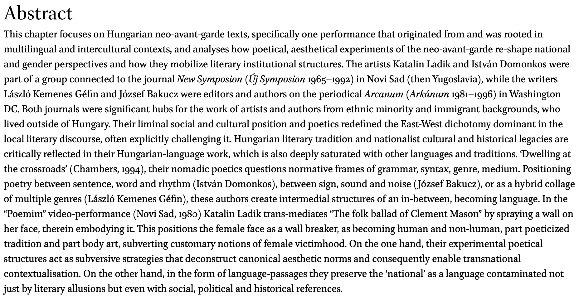 Mónika Dánél’s study, Chapter 9 Poetical and Institutional Nomadism: Figures of In-betweenness in the Hungarian Neo-Avant-Garde, has been published in the Brill volume A Hundred Years of Avant-Gardes. For more information: https://brill.com/display/title/71958.
