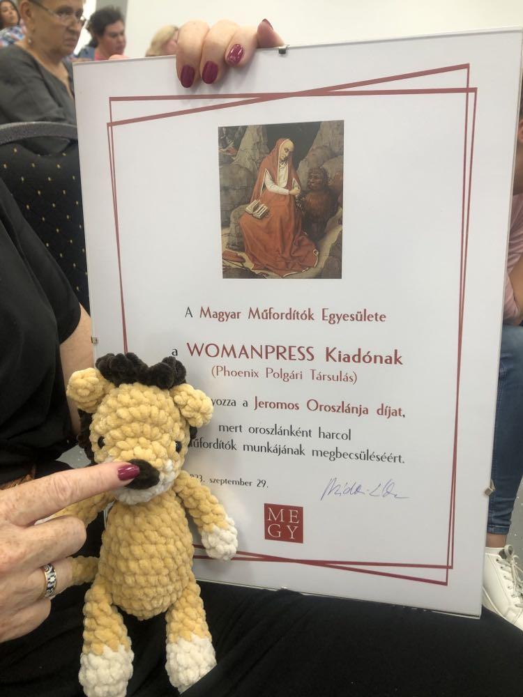 A Womanpress/Phoenix Library kiadó nyerte el a Magyar Műfordítók Egyesülete (MEGY) Jeromos Oroszlánja díját, amelyet az egyesület elnökétől, Nádori Lídiától a kiadó vezetője, Bolemant Lilla vett át a 28. Budapesti Nemzetközi Könyvfesztiválon. Az eseményről fényképek is készültek.
