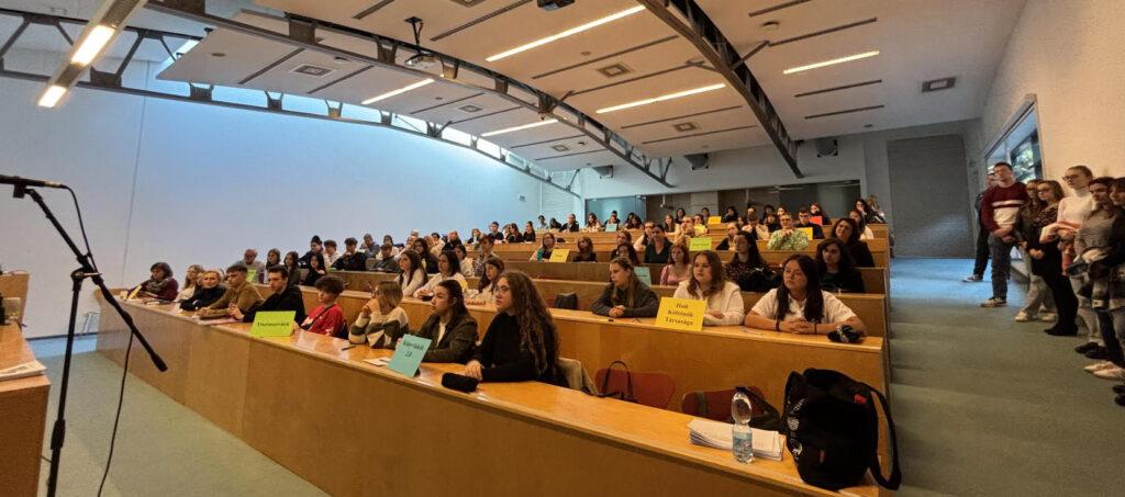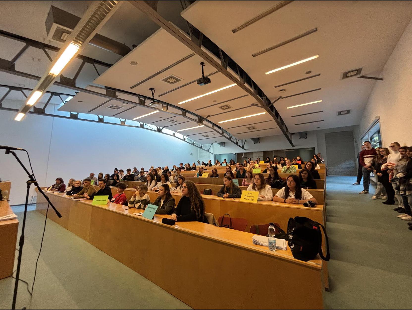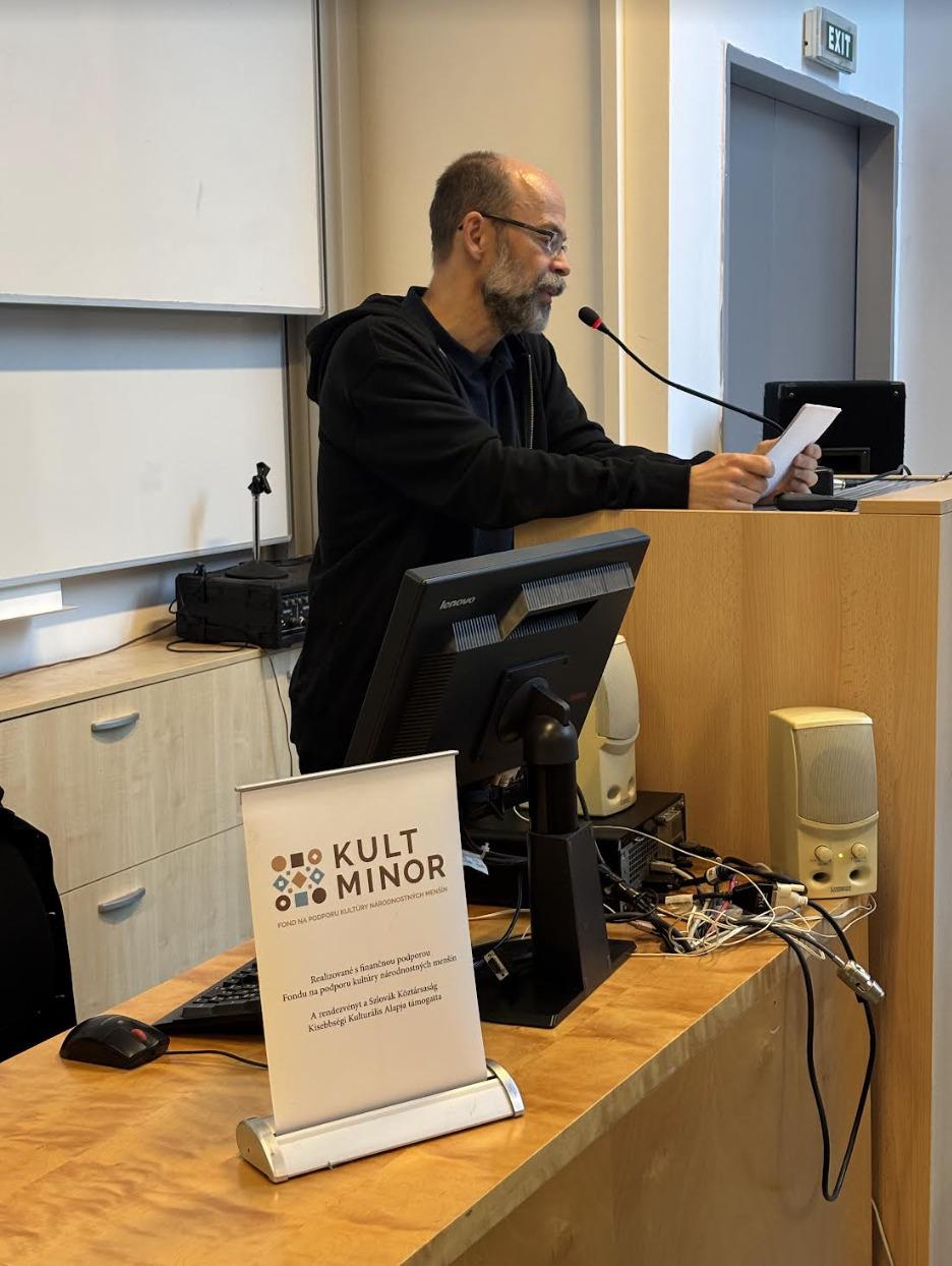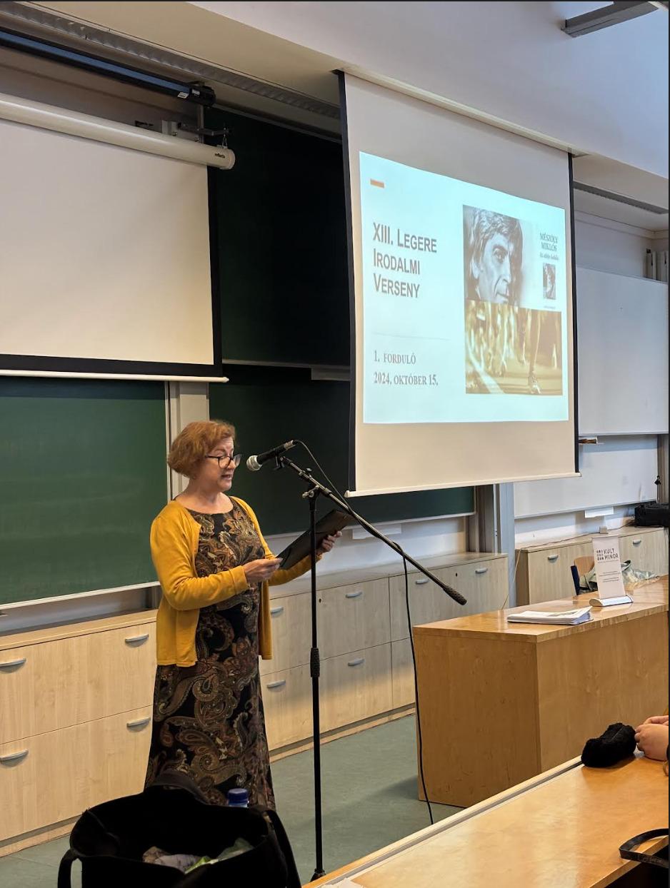 A Nyitrai Konstantin Filozófus Egyetem Magyar Nyelv- és Irodalomtudományi Intézete 13. alkalommal rendezi meg a Legere Irodalmi Versenyt középiskolások számára, ezúttal irodalom, sport, gasztronómia témában. Az első fordulóra 2024. október 15-én került sor. A versenyfeladatok Mészöly Miklós Az atléta halála c. regényére épültek. A verseny ideje alatt a felkészítő tanárok Vinczellér Katalin módszertani foglalkozásán vettek részt. Benyovszky Krisztián A könyvárból a konyhába és vissza. Gasztronómiai kalandozások az irodalomban címmel tartott előadást. A verseny szervezői között Bázis-tagok is vannak: Petres Csizmadia Gabriella, N. Tóth Anikó, Bárczi Zsófia és Benyovszky Krisztián. Fotó: Hajabács Zsuzsa.