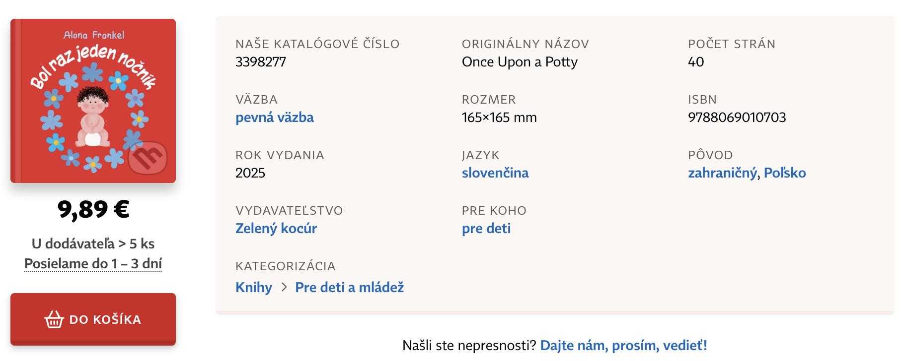 Táto obrázková knižka približuje dlhý (a často zložitý) proces učenia sa na nočník, odporúčame rodičom aj deťom. Už len tým, že otvorene hovorí o často tabuizovanej téme (a zdôrazňujeme: neučí, iba o nej hovorí!), výrazne pomáha, aby sa tŕnistá cesta od plienky k nočníku stala prirodzenou a bezproblémovou."