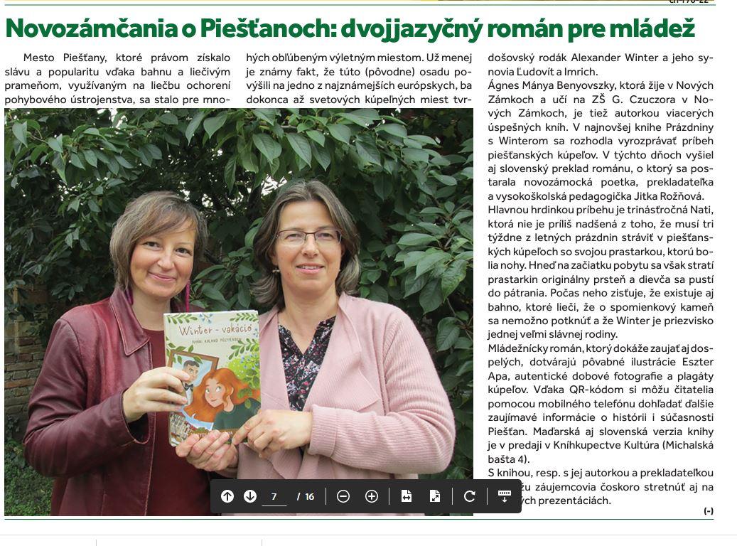 O mládežníckom románe Ágnes Mánya Benyovszky Prázdniny s Winterom v Piešťanoch - preklad: Jitka Rožňová - uverejnili recenziu časopise Castrum Novum (7. 11. 2022, č. 21):