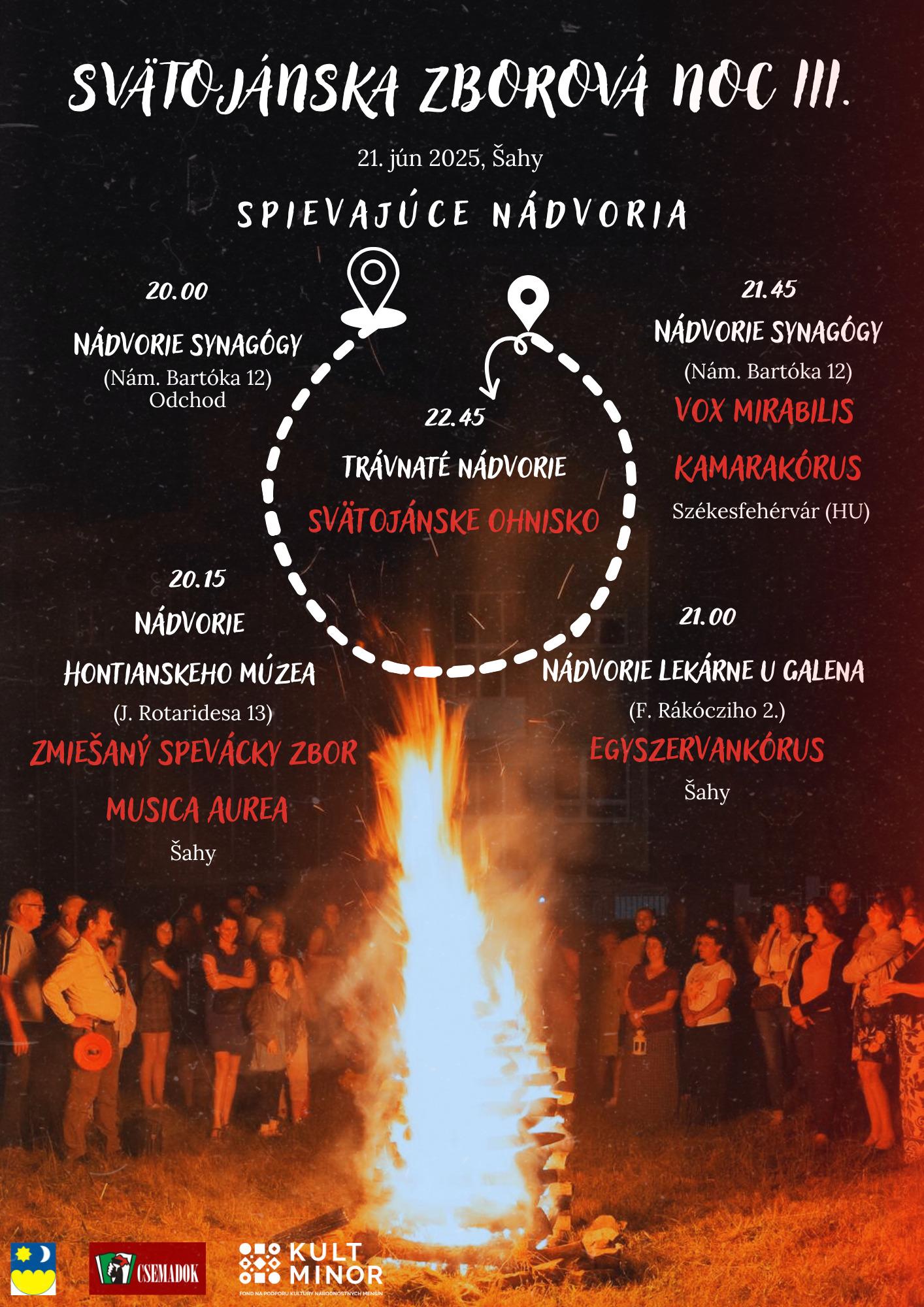 Svätojánska zborová noc III. - Spievajúce nádvoria. Odchod: 20.00 - Nádvorie synagógy (Nám. Bartóka 12), 20.15 - Nádvorie Hontianskeho múzea (J. Rotaridesa 13) - Zmiešaný spevácky zbor Musica Aurea, Šahy (zbormajster: Gábor Béres), 21.00 - Nádvorie Lekárne u Galena (F. Rákócziho 2.) - Egyszervankórus, Šahy (zbormajster: Gábor Béres), 21.45 - Nádvorie synagógy - Vox Mirabilis Kamarakórus, Székesfehérvár (HU), (zbormajsterka: Katica Zemlényi), 22.45 - svätojánske ohnisko (trávnaté nádvorie pri synagóge).