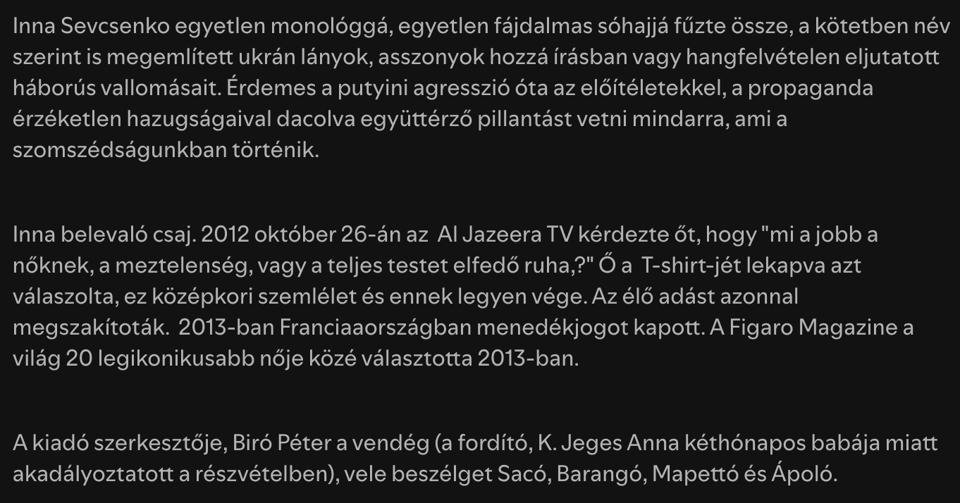 Hangfelvétel a Tilos Rádióból: Deczki Sarolta részvételével beszélgetés Inna Sevcsenko Levél keletről című kötetéről. A beszélgetés a Spotify-on hallgatható meg.