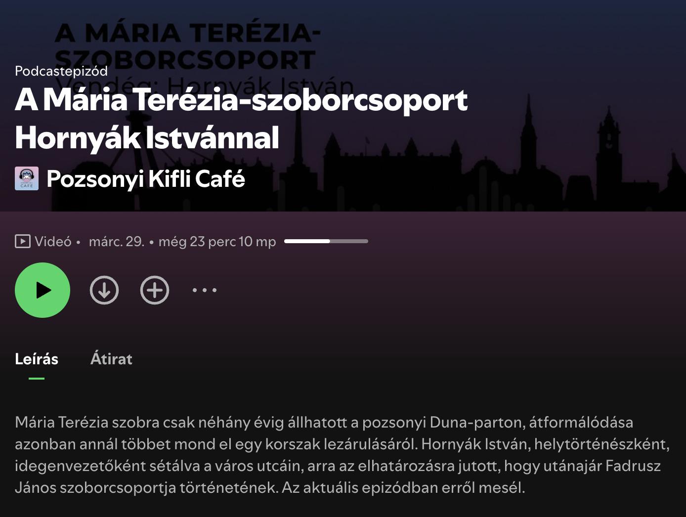 Pozsonyi Kifli Café. Hornyák Istvánnal a pozsonyi Mária Terézia-szoborcsoport történetéről Paszmár Lívia beszélgetett. A beszélgetés elérhető a Pozsonyi Kifli honlapján: https://pozsonyikifli.sk/.