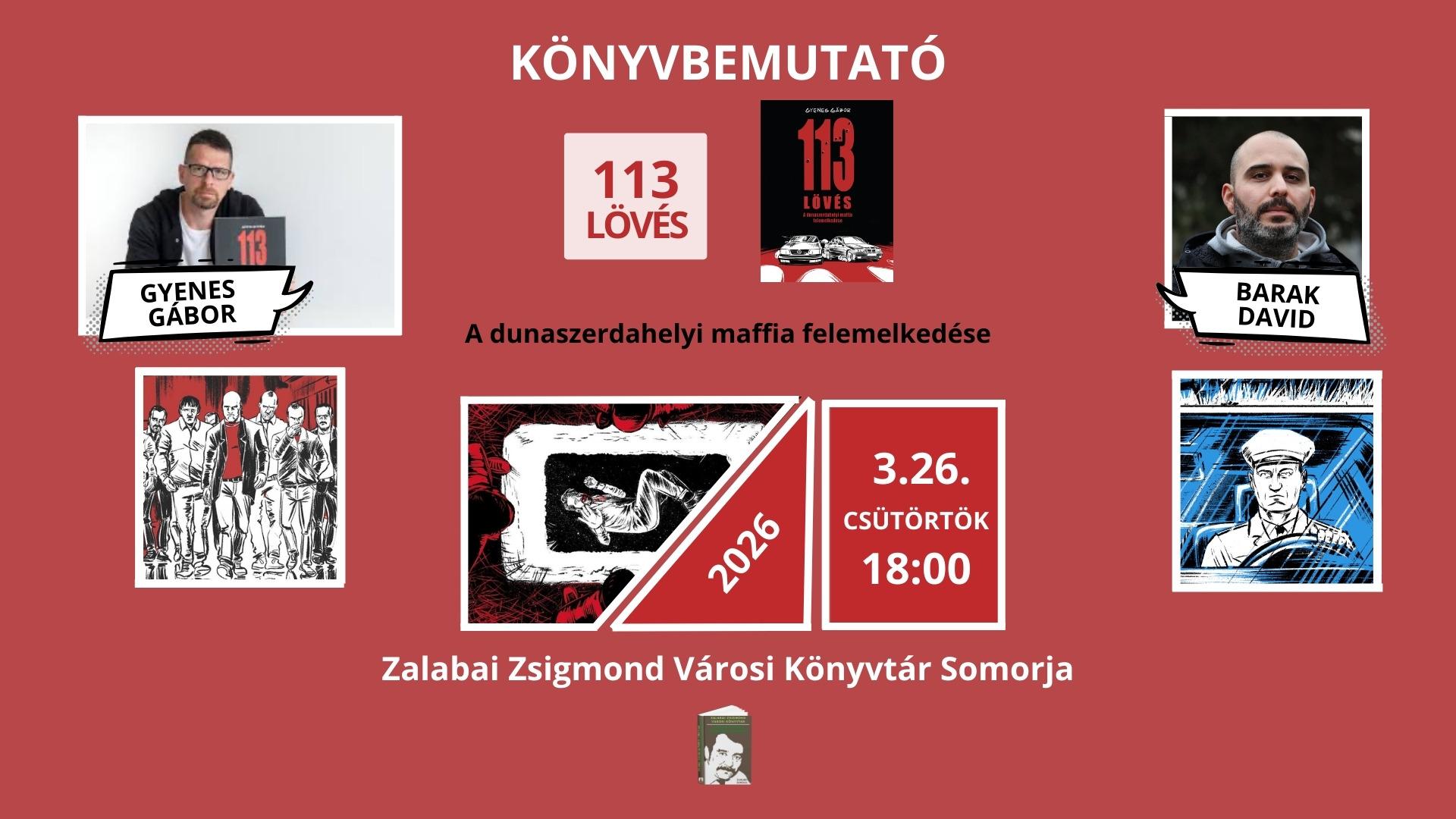 A dunaszerdahelyi maffia felemelkedése. Beszélgetés Gyenes Gáborral 113 lövés című képregényéről és Barak Dávid oknyomozó riporterrel Elásott igazság című kötetéről a somorjai Zalabai Zsigmond Könyvtárban (Somorja, Park utca 4.) 2026. március 26-án, csütörtökön 18.00-kor. Bővebb információk az esemény Facebook-oldalán olvashatók.