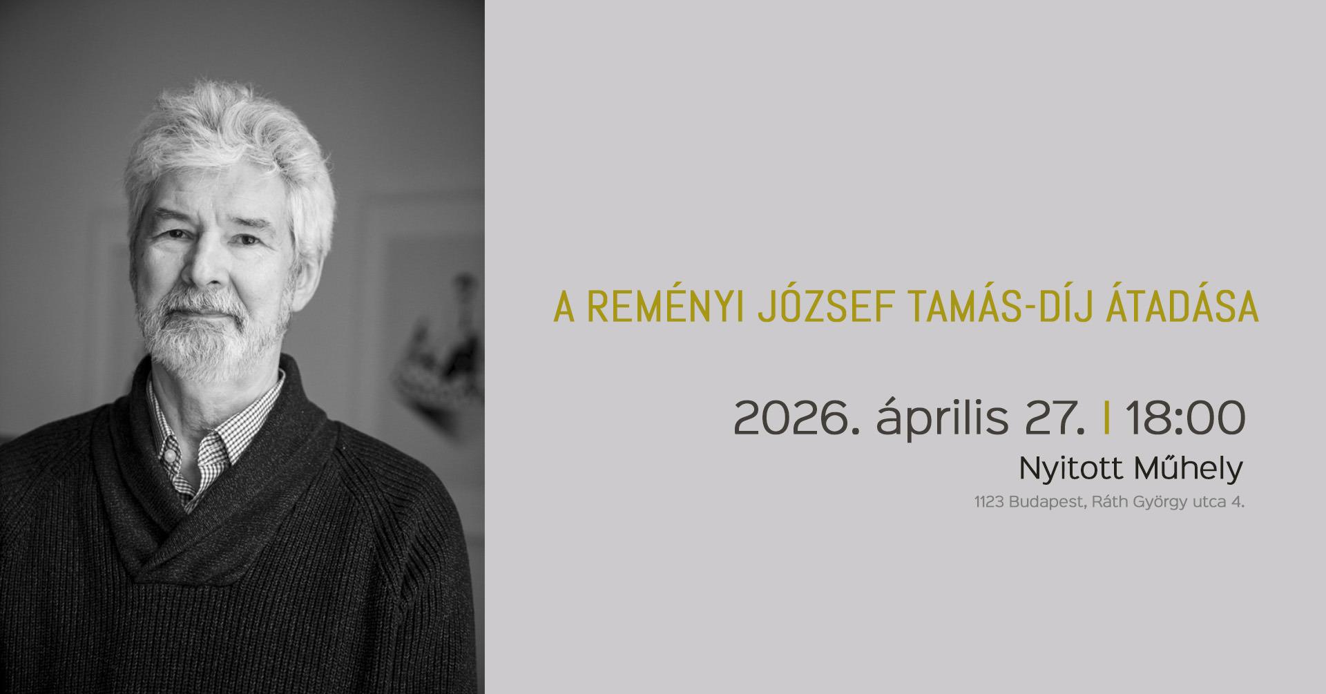 2026. április 27-én, hétfőn 18.00-kor kerül sor az idei Reményi József Tamás-díj átadására a Nyitott Műhelyben (Budapest, Ráth György utca 4.). Bővebb információk az esemény Facebook-oldalán olvashatók: