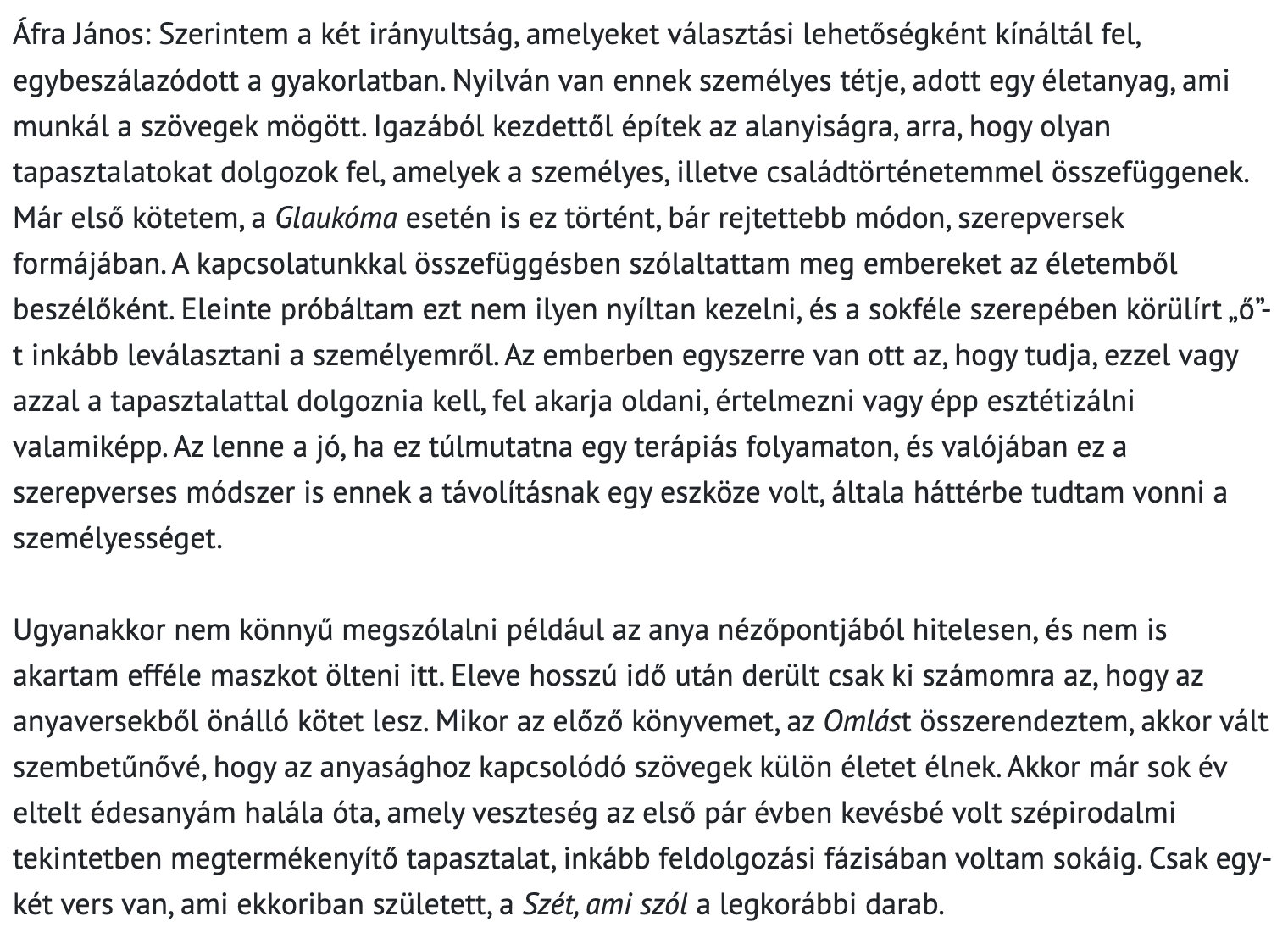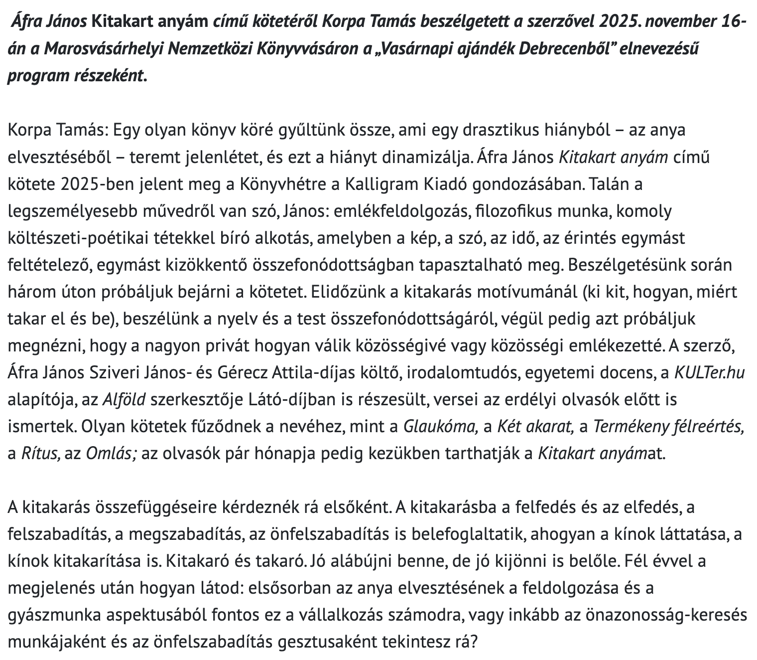 Áfra Jánossal Kitakart anyám című kötetéről Korpa Tamás beszélgetett az Újváradban. A beszélgetést Gálfalvi Ágnes jegyezte le, és az Újvárad online felületén olvasható teljes terjedelemben.