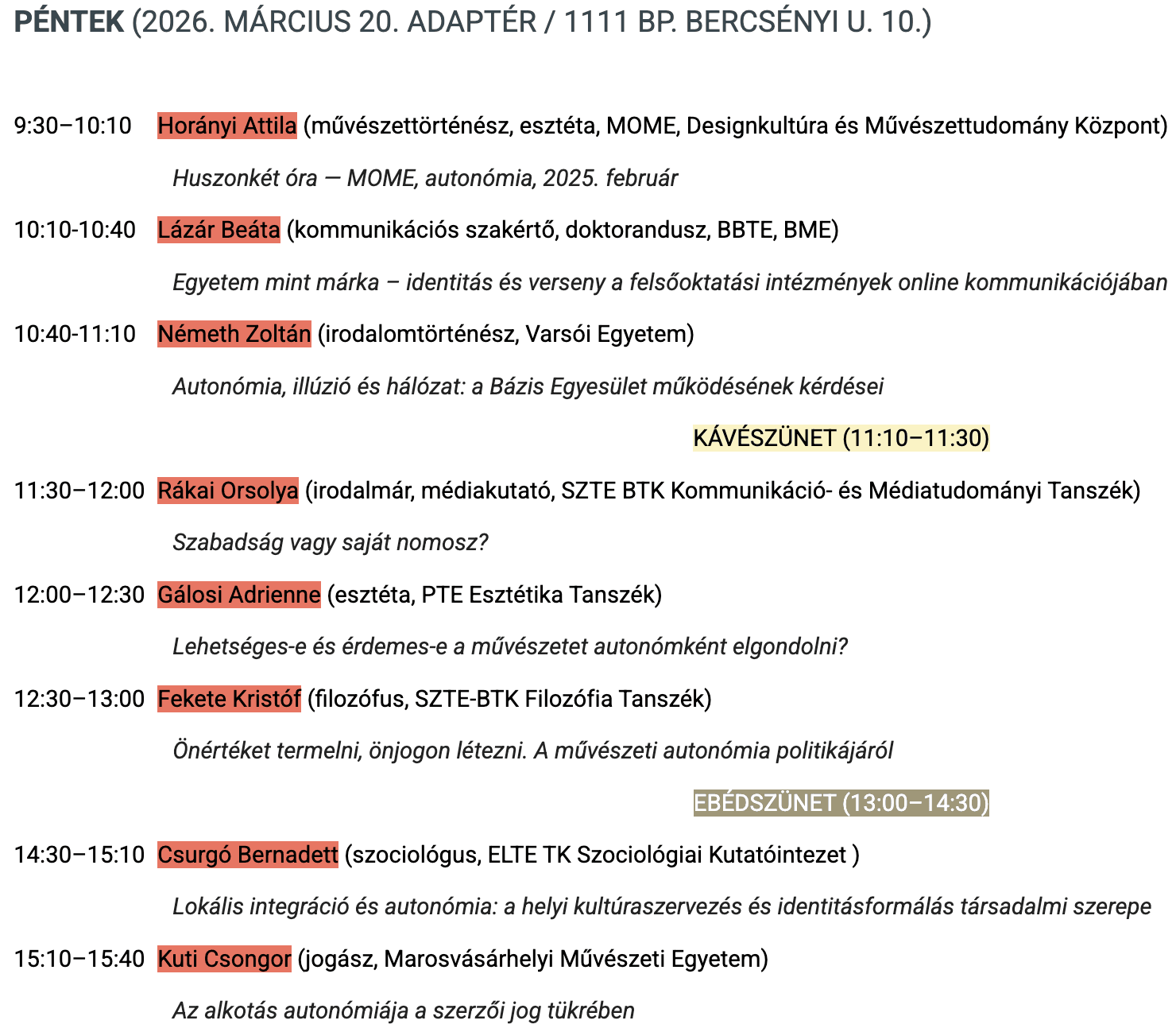 Autonómia, illúzió és hálózat: a Bázis Egyesület működésének kérdései. Németh Zoltán tart előadást a BME és az ELTE Autonómia – ideál, illúzió, ideológia? című konferenciáján az Adaptérben (Budapest, Bercsényi u. 10.). További információk: https://sites.google.com/view/kdfi/kdfi-sorozat?authuser=0. A konferencia programja: https://sites.google.com/view/kdfi2026/program?authuser=0.