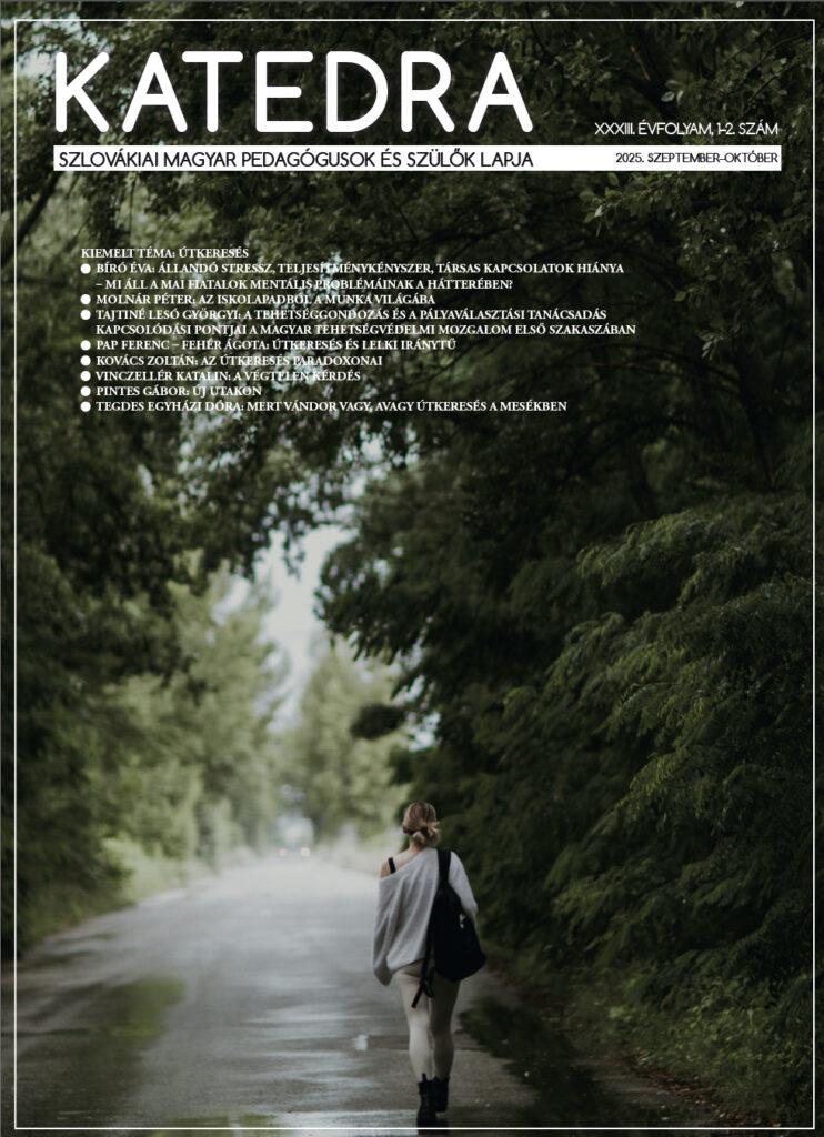 Szeptember közepén, ma jelent meg a digitális Katedra folyóirat legújabb duplaszáma, amely a tanévkezdés témájával összecsengve elsősorban az útkeresés kérdéskörével foglalkozik. A 33. évfolyam nyitószámában számos hazai és magyarországi szerző pedagógiai-pszichológiai és szaktárgyi-módszertani írását találják meg az érdeklődő olvasók. Új utakon címmel Pintes Gábor vezércikkével indul a lapszám, melyet egy a teljesítménykényszerrel és állandó stressz nyomásával foglalkozó interjú követ – Bíró Éva Ferenczi Mária pszichológussal beszélget a rovatban. Molnár Péter és Tajtiné Lesó Györgyi a pályaválasztás tükrén keresztül járja körül az útkeresés témáját. Pap Ferenc és Fehér Ágota, valamint Kovács Zoltán az útkeresés pszichológiai-lelki, mentális-szellemi vonatkozásait veti fel. Vinczellér Katalin és Tegdes Egyházi Dóra egy-egy irodalompedagógiai szakcikkel dolgozza fel a témát, és néhány ifjúsági regény- és népmesehős útkereső attitűdjét mutatja be. Benes Tarr Csilla a Vekker Műhely drámapedagógiai foglalkozásaiból kínál ízelítőt, Szendi Tünde pedig az Életmesék-projekt oktatásbeli felhasználhatóságát ismerteti. Magyar Ágnes a fogalmazástanítás egyik komolyabb kihívásáról, az értékelés és visszajelzés lehetőségeiről elmélkedik a tanulmányában. Hegedűsné Tóth Zsuzsanna az óvodásoknak szóló Tesz-vesz muzsika módszertanába vezeti be az olvasót. Gáspár Noémi gamifikációs tapasztalatairól számol be, Zsemberovszky Zita pedig egy projekthét menetét ismerteti írásában. Csicsay Alajos folytatja a Világaink című rovatát, ezúttal a környezetvédelem témájával foglalkozik. Oros Bugár Anna, Kozmács István és Vančo Ildikó a szlováknyelv-tanárok képzésében történő innovációs lépésekről számol be. A tudósítások között olvashatunk a XIX. Csengő Énekszóról, a Katedra-versenyek döntőiről, valamint a nyitrai szervezésű transzkulturalizmus-konferenciasorozat legújabb eseményéről. A felvidéki iskolák rovatában ezúttal a galántai Kodály Zoltán Gimnázium mutatkozik be.