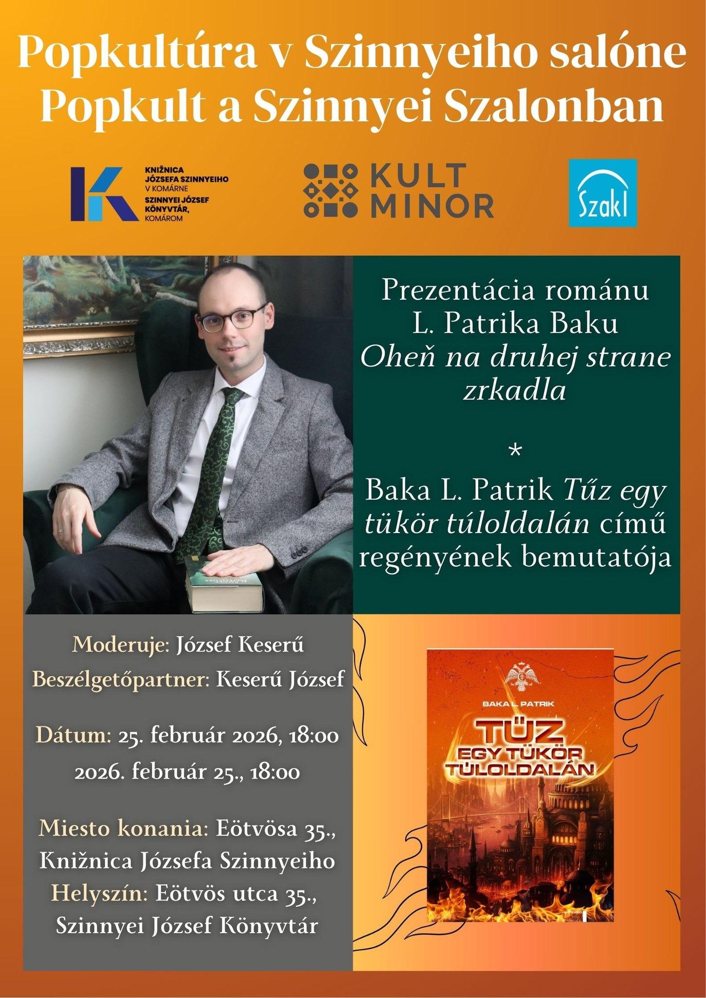Popkult a Szinnyei Szalonban: Baka L. Patrikkal Tűz egy tükör túloldalán című regényéről Keserű József beszélget Komáromban, a Szinnyei József Könyvtárban. Részletek: