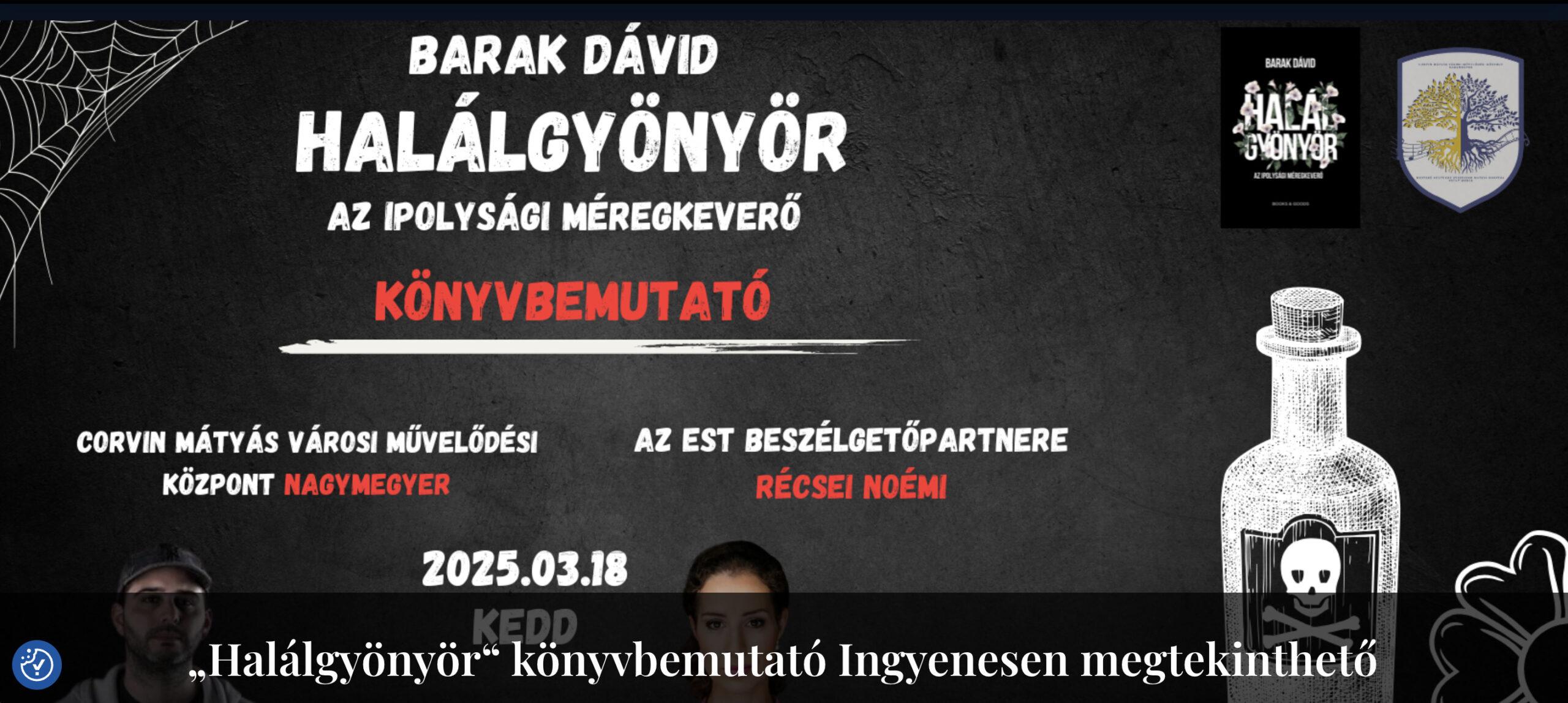 Barak Dáviddal Halálgyönyör című könyvéről Récsei Noémi beszélget Nagymegyeren. Időpont: 2025. március 18., kedd, 17.00. Helyszín: Corvin Mátyás Városi Művelődési Központ, Komáromi utca 18. Bővebb információk és plakát a Corvin Mátyás Városi Művelődési Központ honlapján.