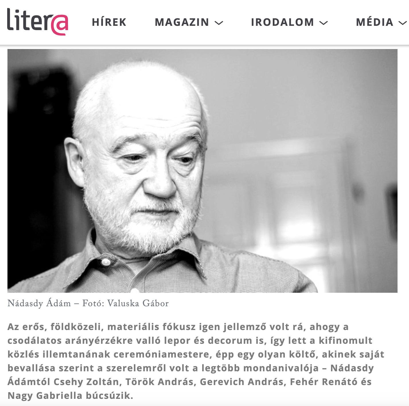 Búcsú Nádasdy Ádámtól. Csehy Zoltán és Gerevich András írásai is helyet kaptak a Literán. Az összeállítás teljes terjedelemben a Literán olvasható.