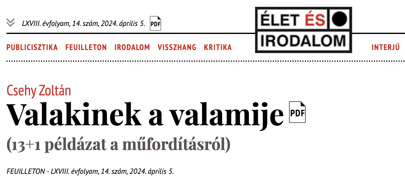 Csehy Zoltán Valakinek a valamije (13+1 példázat a műfordításról) című esszéje az Élet és Irodalomban jelent meg. Teljes terjedelemben az Élet és Irodalom online felületén olvasható.
