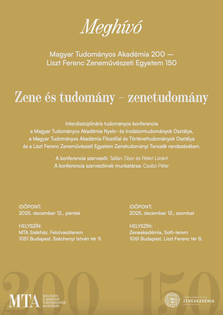 Csehy Zoltán ad elő a Magyar Tudományos Akadémia székházában a Zene és tudomány - zenetudomány című konferencián a Magyar Tudományos Akadémia megalapításának 200. és a Liszt Ferenc Zeneművészeti Egyetem megalapításának 150. évfordulóján. Részletes program: