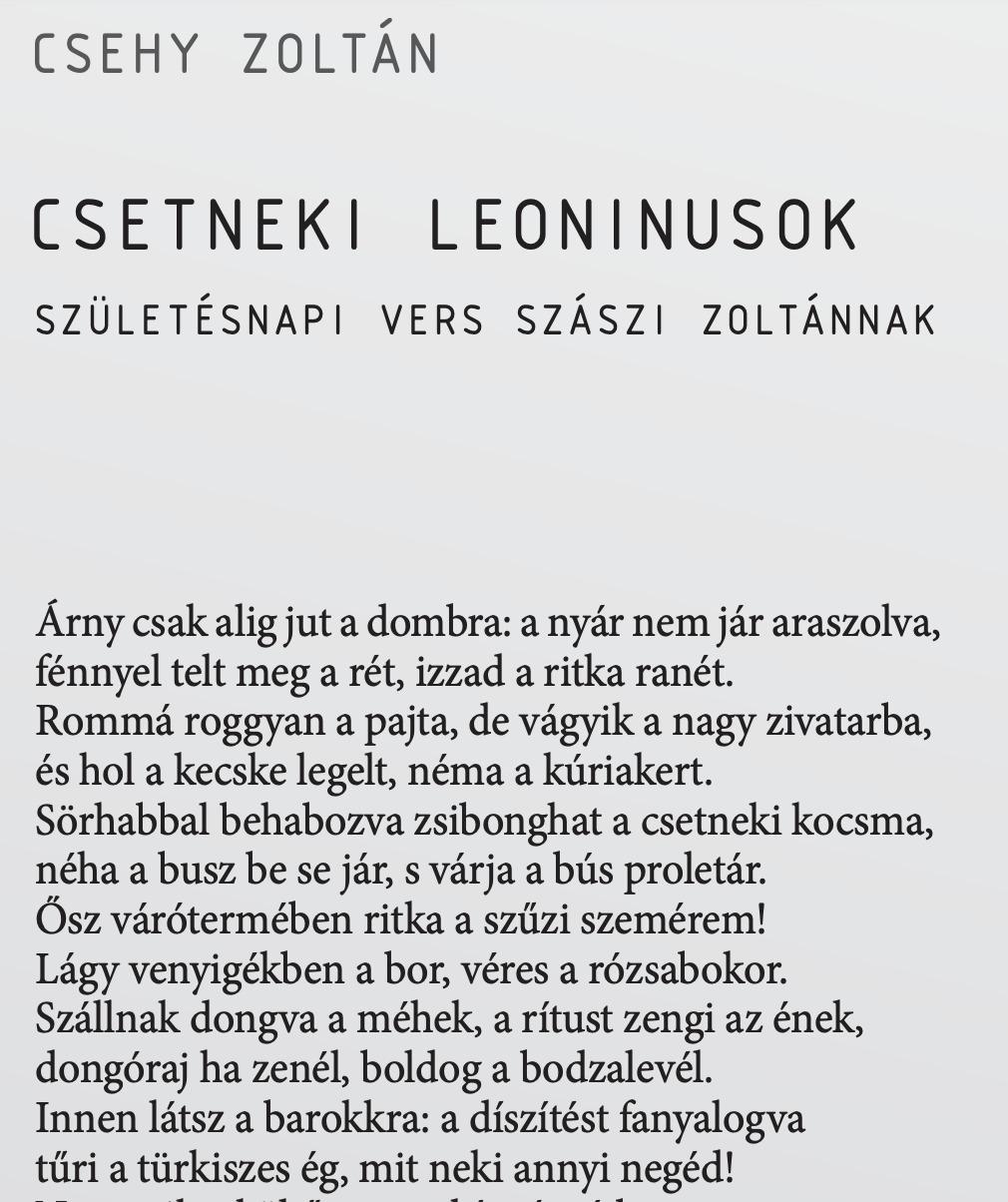 Csehy Zoltánnak a 60. születésnapját ünneplő Szászi Zoltánhoz írt verse az Irodalmi Szemle 2024/3. számában jelent meg. A vers teljes terjedelemben a nyomtatott Irodalmi Szemlében olvasható.