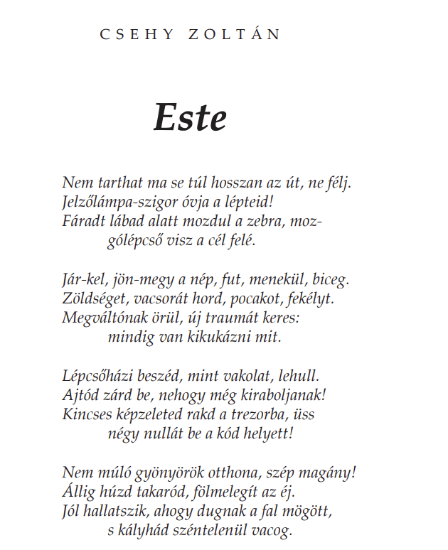 Csehy Zoltán három verse a Jelenkor 2026/1. számában jelent meg. Teljes terjedelemben a nyomtatott Jelenkorban olvasható.
