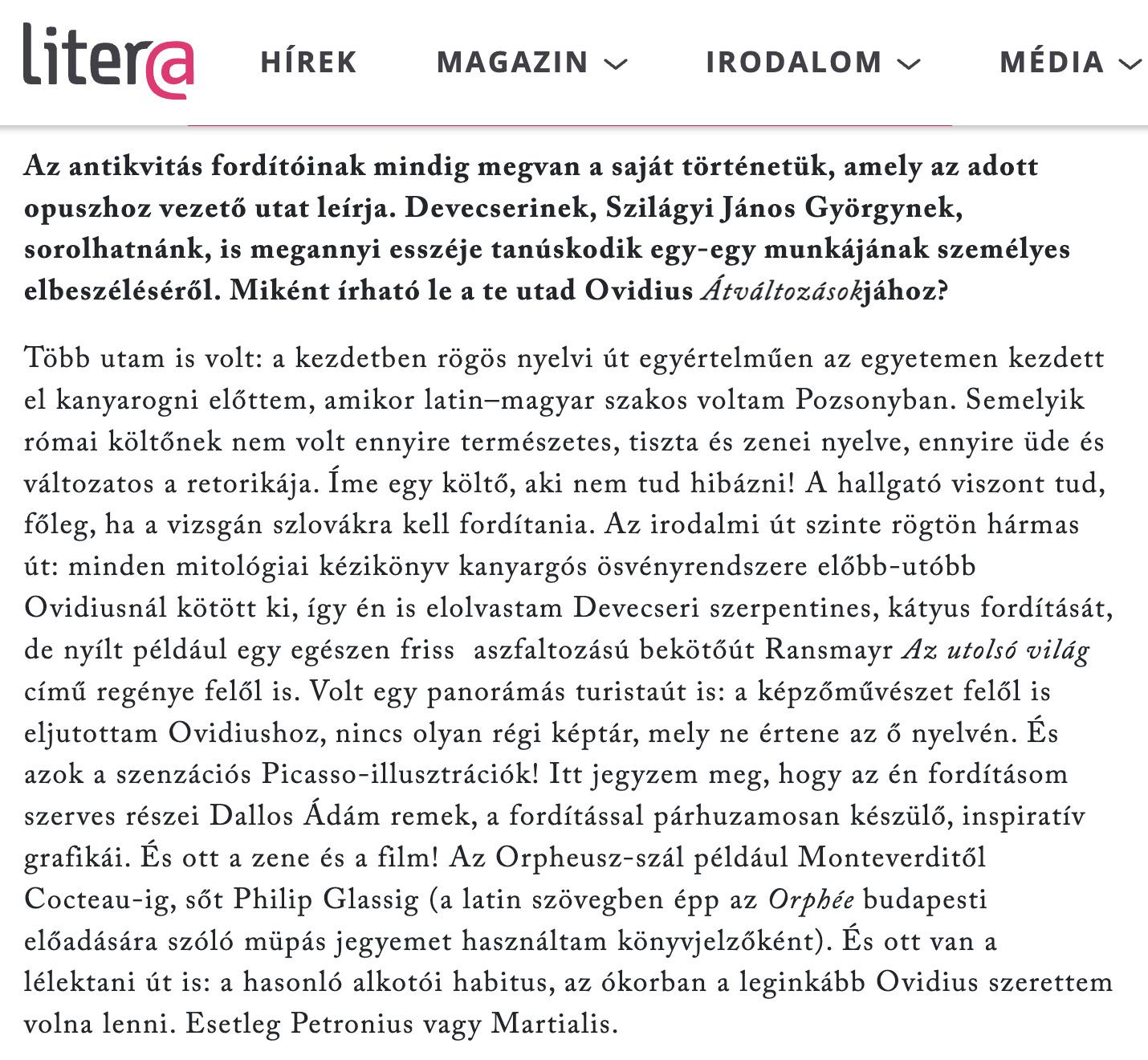Csehy Zoltánnal Ovidius Átváltozásokjának fordításáról Jánossy Lajos beszélgetett a Literán. Az interjú teljes terjedelemben a Literán olvasható.