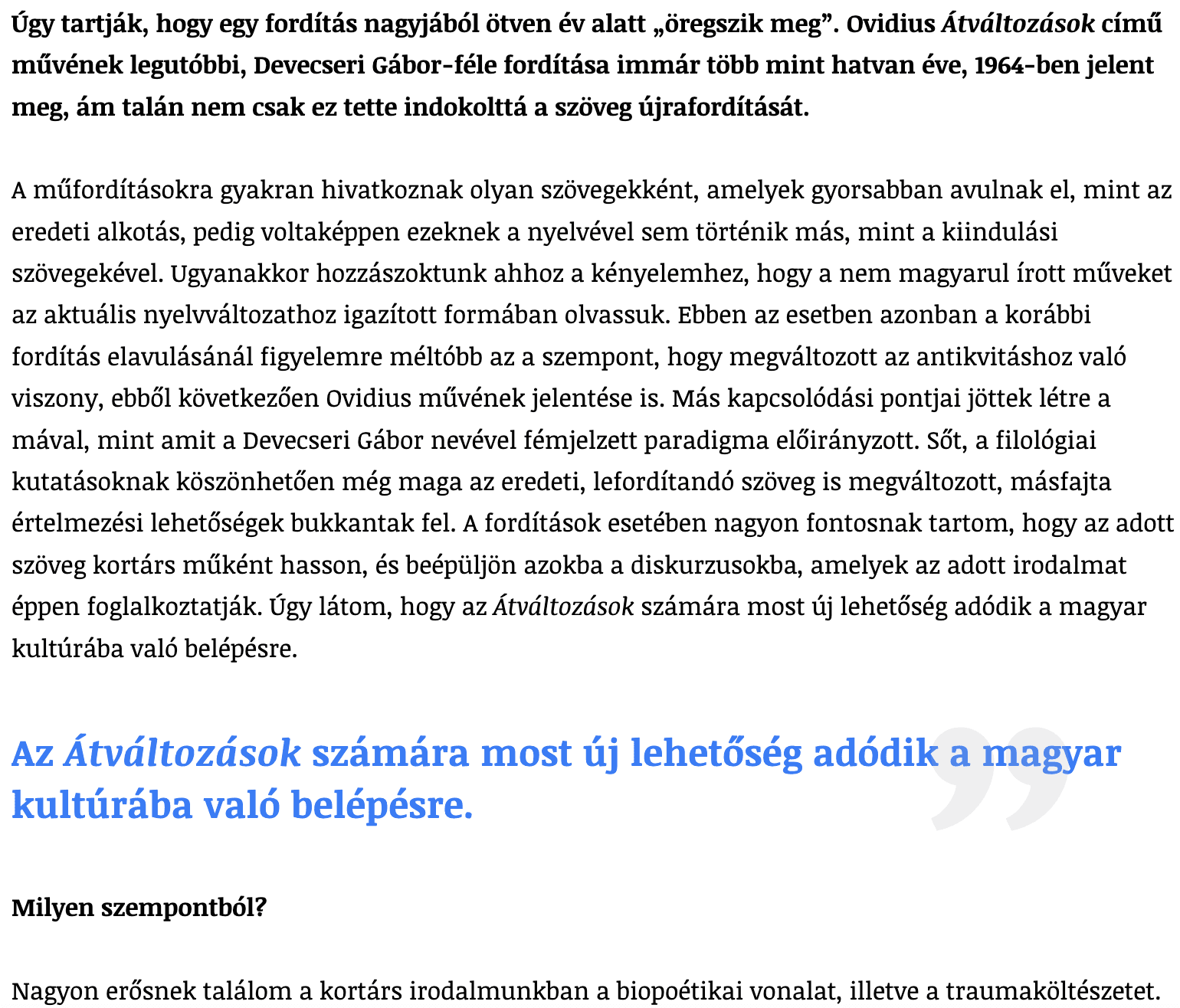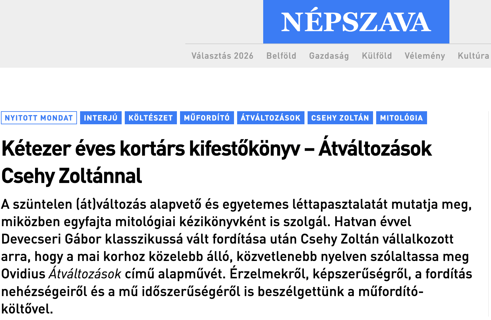 Csehy Zoltánnal Ovidius Átváltozásokjának fordításáról Németh Luca Anna beszélgetett a Népszavában. A beszélgetés teljes terjedelemben a Népszava online felületén olvasható.