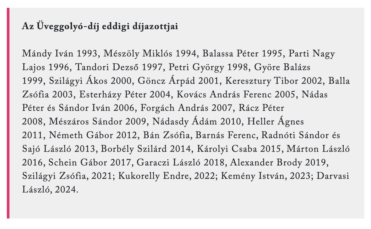 Deczki Sarolta az Írók Boltja Üveggolyó-díjában részesült 2025. június 11-én! Gratulálunk Deczki Saroltának, a Bázis tagjának! Deczki Saroltát Darvasi László laudálta. Részletes információk a Literán olvashatók: https://litera.hu/hirek/deczki-sarolta-nyerte-el-az-idei-uveggolyo-dijat.html. Darvasi László laudációja szintén a Literán olvasható: https://litera.hu/irodalom/publicisztika/darvasi-laszlo-deczki-sarolta-koszontese.html.