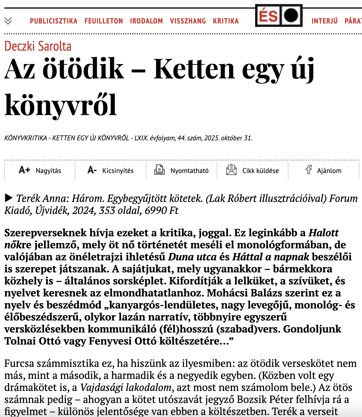 Deczki Sarolta kritikája Terék Anna Három című verseskötetéről az Élet és Irodalomban jelent meg. Teljes terjedelemben az ÉS online felületén olvasható.