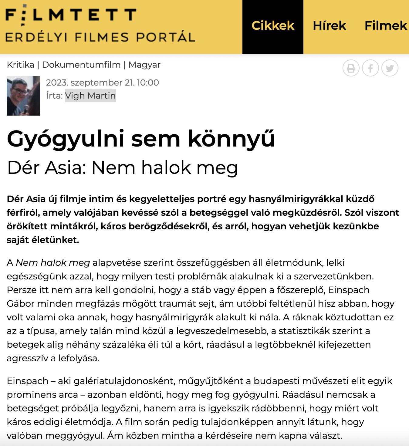 Dér Asia Nem halok meg című filmjéről Vigh Martin írt kritikát a Filmtettben, ahol az írás teljes terjedelemben olvasható.