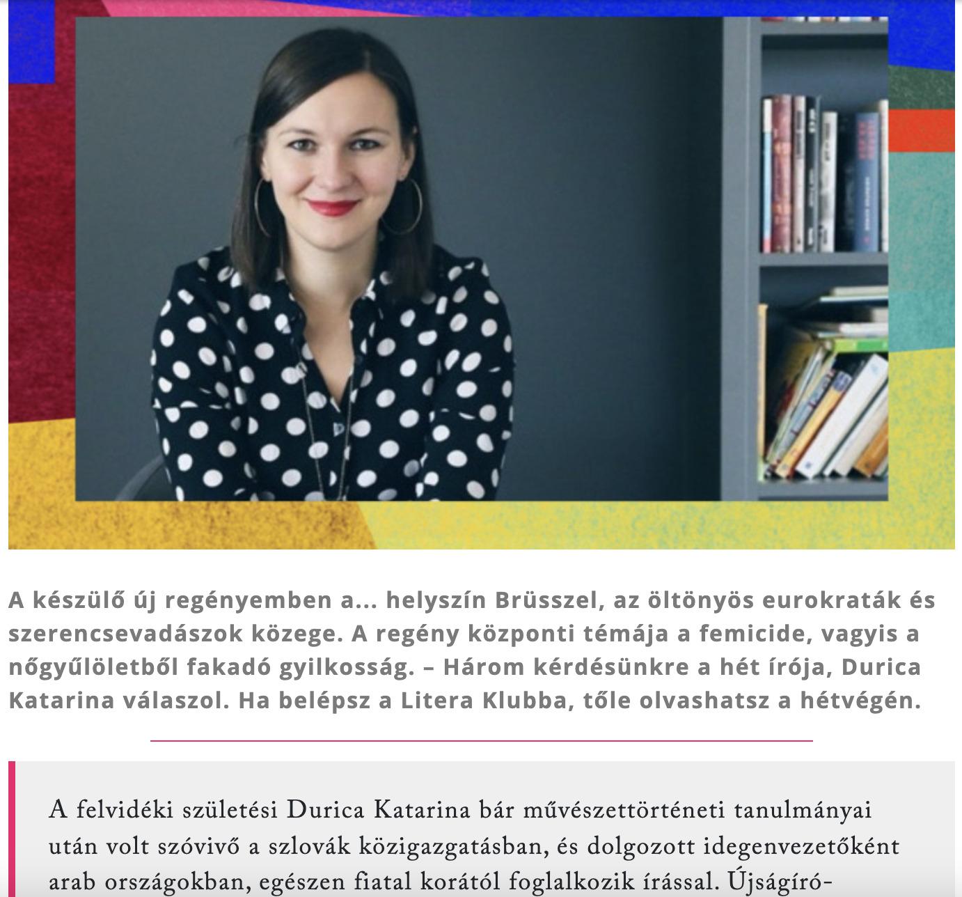 Durica Katarina volt A hét írója a Literán! Ennek kapcsán a Litera szerkesztői bemutatták Durica Katarina eddigi pályáját, illetve három kérdést tettek fel, amelyre válaszolt. A hét írója összeállítás Durica Katarinával teljes terjedelemben a Literán olvasható.
