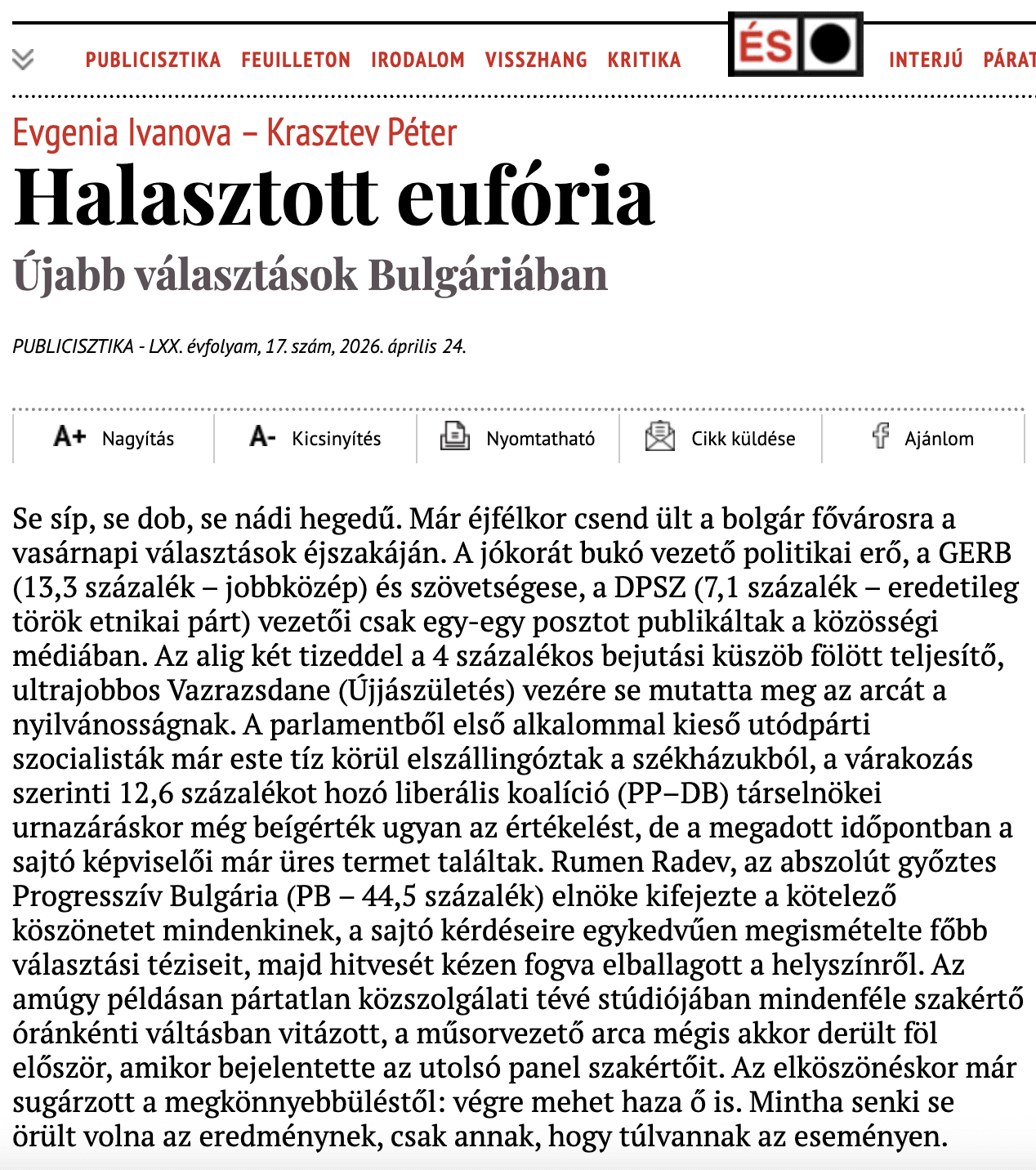 Evgenia Ivanova és Krasztev Péter "Halasztott eufória. Újabb választások Bulgáriában" című írása az Élet és Irodalomban jelent meg. Teljes terjedelemben az ÉS online felületén olvasható.