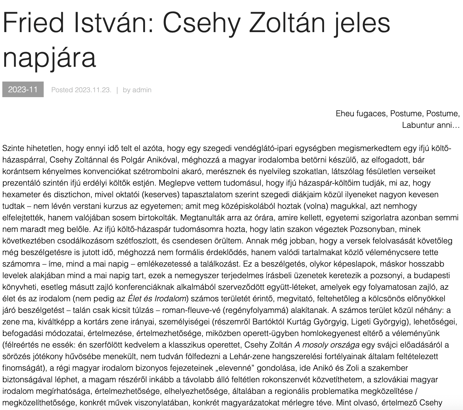 Fried István Csehy Zoltán születésnapjára írt esszéje az Irodalmi Szemle “Csehy Zoltán 50”-számában jelent meg. Teljes terjedelemben az Irodalmi Szemle online felületén olvasható.