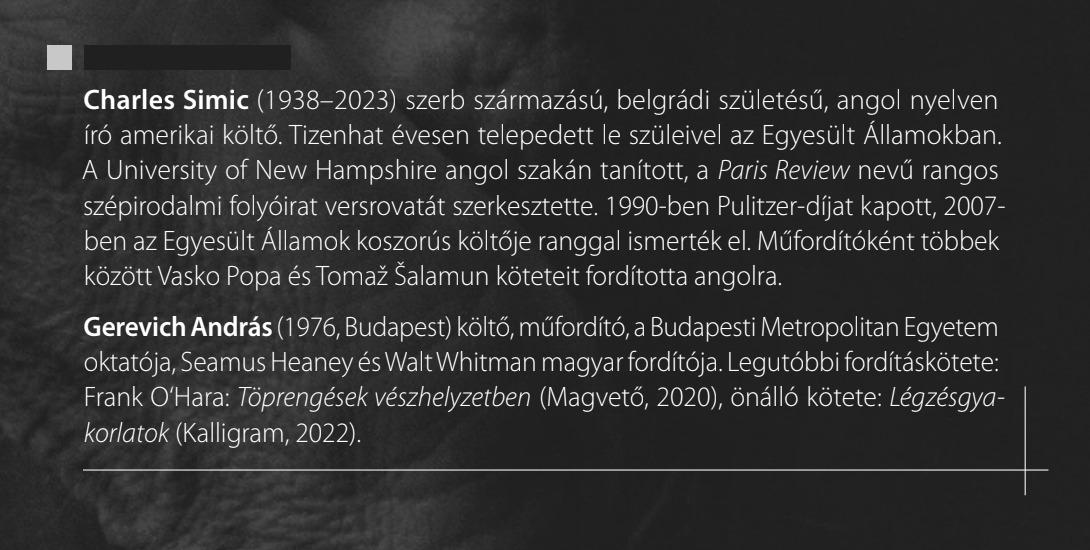 Gerevich András fordításában jelent meg Charles Simic négy verse a Kalligram 2023/9. számában. A versek a nyomtatott Kalligramban vagy a Szófán olvashatók.
