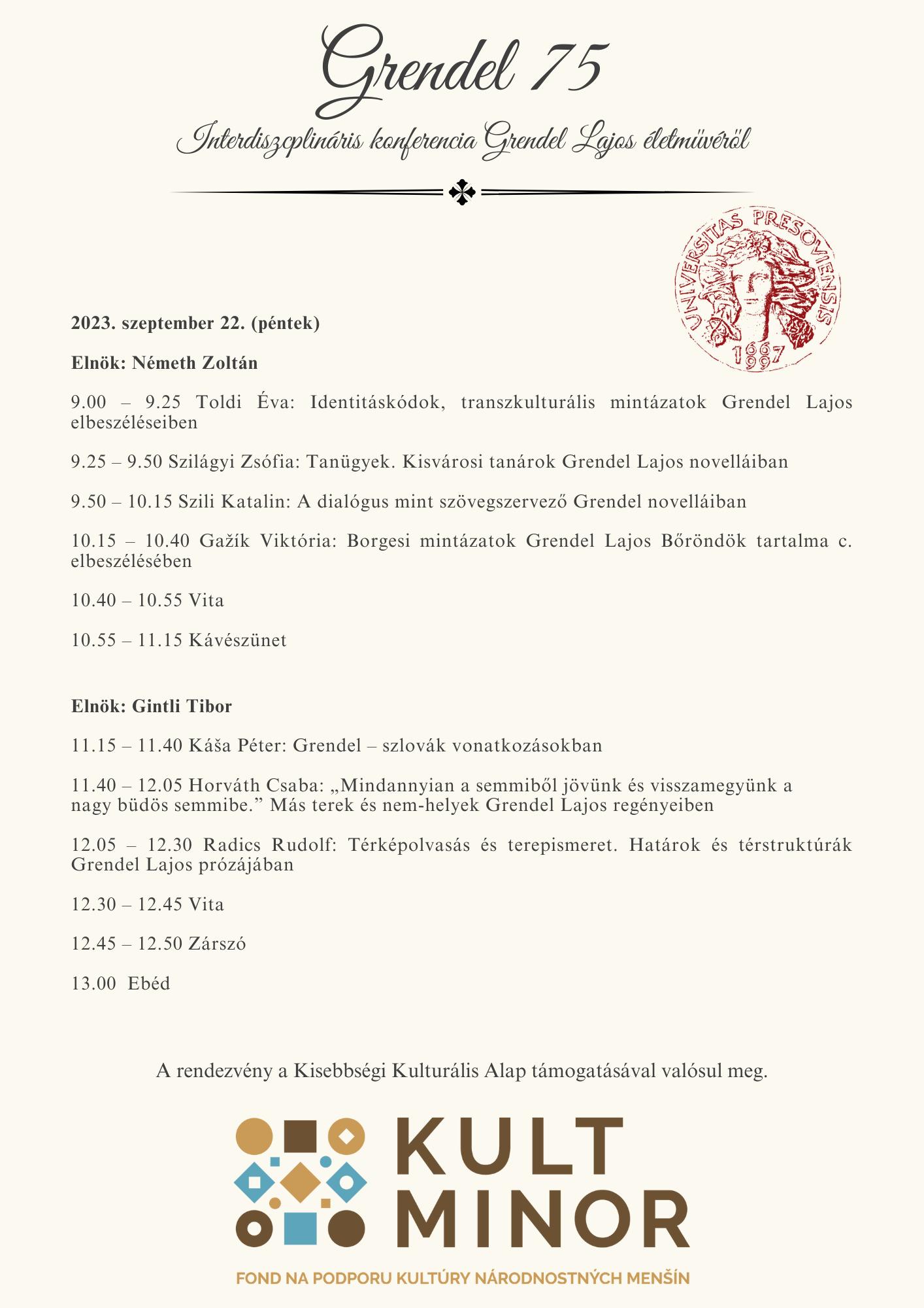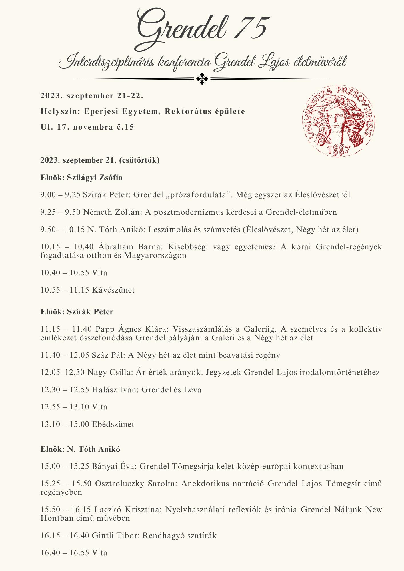 Grendel 75 címmel rendez interdiszciplináris konferenciát az Eperjesi Egyetem Magyar Nyelv és Kultúra Intézete Gintli Tibor és Radics Rudolf szervezésében 2023. szeptember 21-22-én, csütörtök-pénteken.