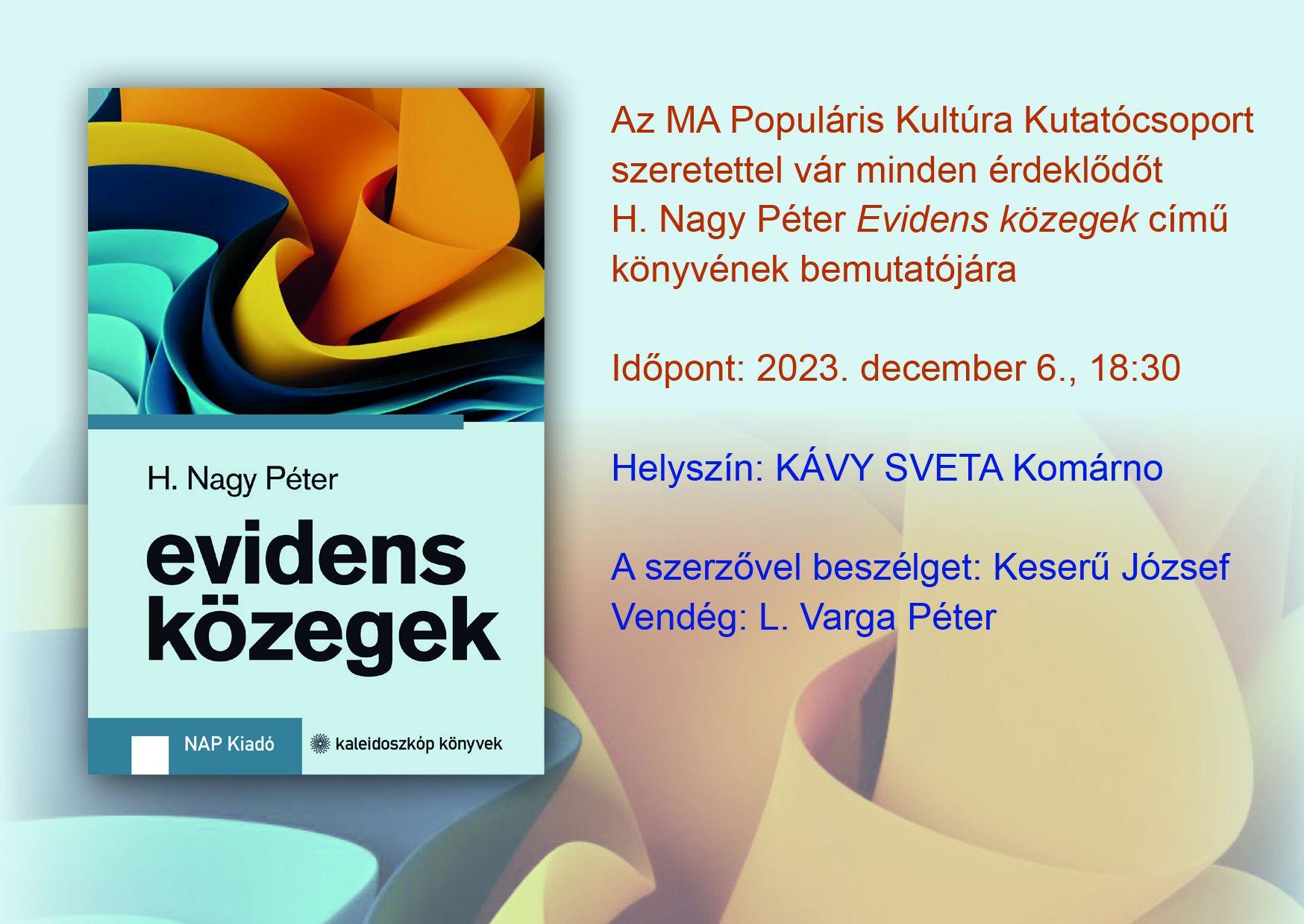H. Nagy Péterrel Evidens közegek című kötetéről Keserű József beszélget Komáromban 2023. december 6-án. Vendég: L. Varga Péter. További információk az esemény Facebook-oldalán.