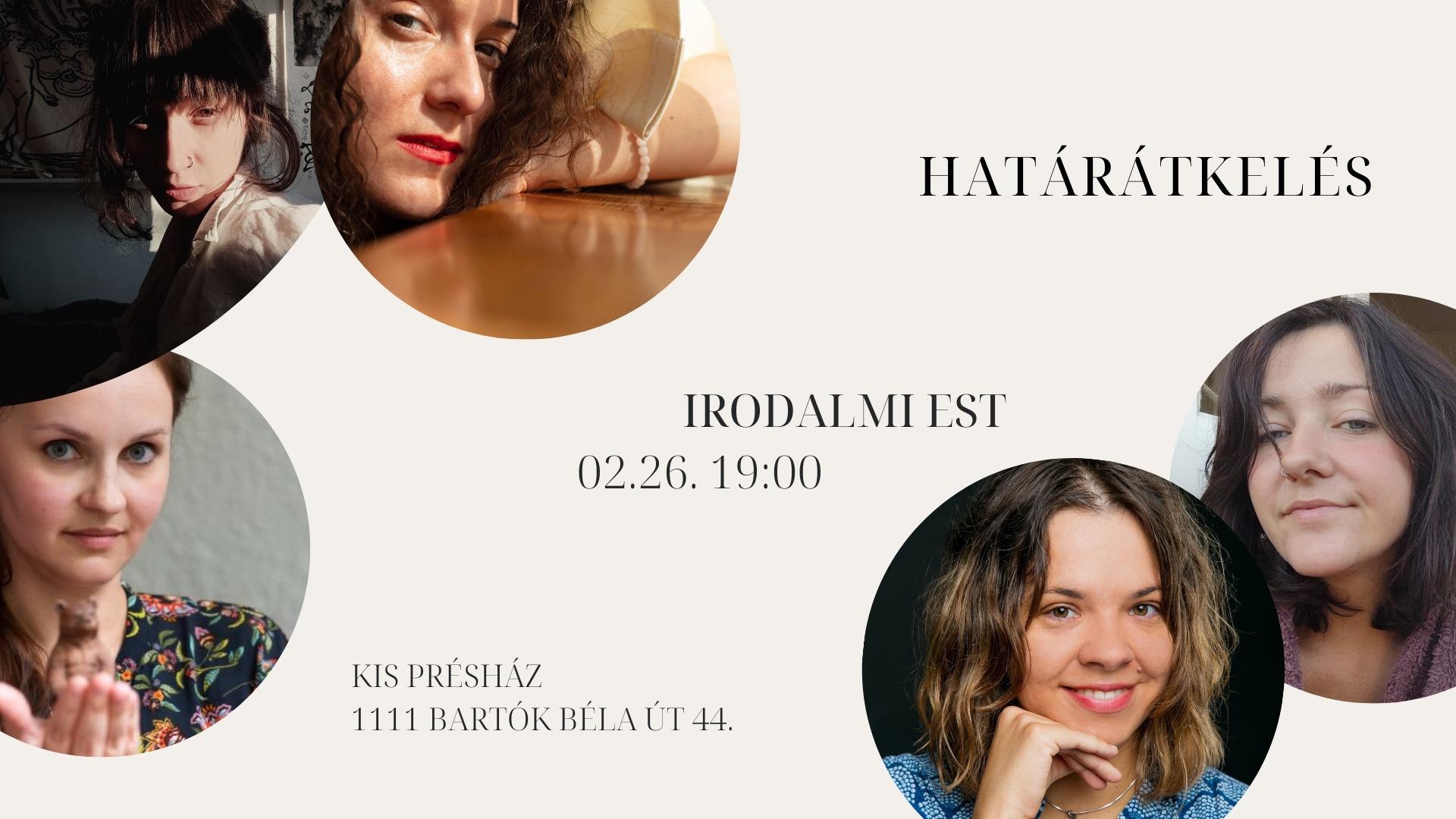 Határátkelés címmel kerül sor Deres Kornélia, Fenyvesi Orsolya, Izsó Zita, Kali Ágnes és Nagy Hajnal Csilla irodalmi estjére a Kis Présházban (Budapest, Bartók Béla út 44.). Időpont. 2024. február 26., hétfő, 19:00. További részletek az esemény Facebook-oldalán olvashatók.