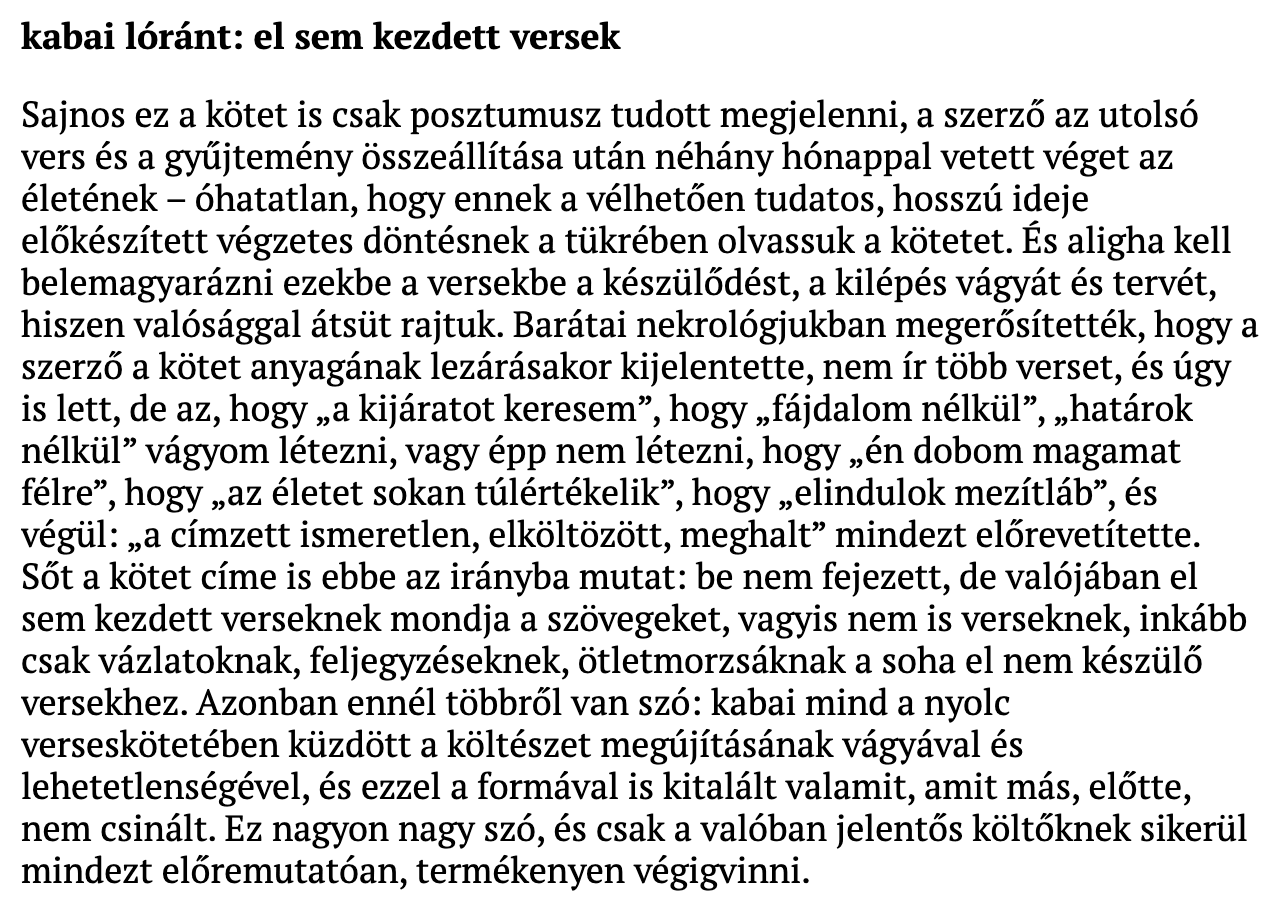 Kabai Lóránt El sem kezdett versek című kötetéről Bedecs László írt kritikát az Élet és Irodalomba. A kritika teljes terjedelemben az ÉS online felületén olvasható.