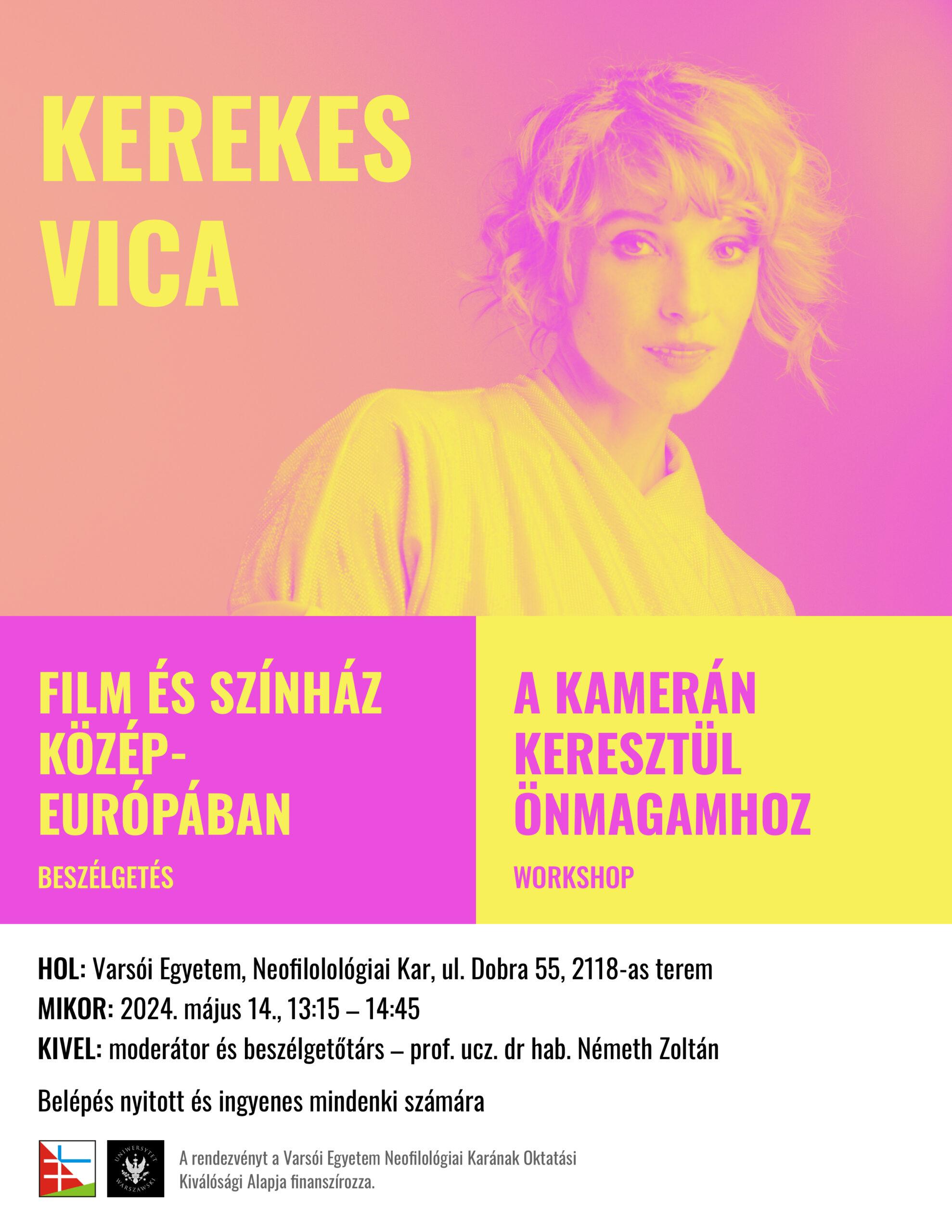Kerekes Vicával Németh Zoltán beszélget Varsóban, a Varsói Egyetem Neofilológiai Karának Magyar Tanszékén, majd pedig Kerekes Vica A kamerán keresztül önmagamhoz címmel workshopot tart arról, hogyan győzzük le gátlásainkat és erősítsük képességeinket. Az esemény szervezője Magdalena Roguska-Németh. A beszélgetés és a workshop nyelve a magyar. Időpont: 2024. május 14., kedd, 13.15-14.45. Helyszín: Wydział Neofilologii Uniwersytetu Warszawskiego, Dobra 55, 00-312 Warszawa, sala 2118. A belépés nyitott és ingyenes mindenki számára.