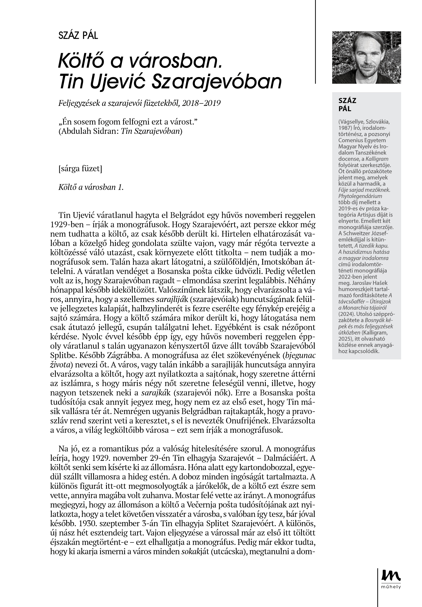 Költő a városban. Száz Pál feljegyzései a szarajevói füzetekből a Műhelyben jelentek meg. Teljes terjedelemben a Műhely honlapján olvashatók: https://gyorimuhely.hu/2024-5-6/.