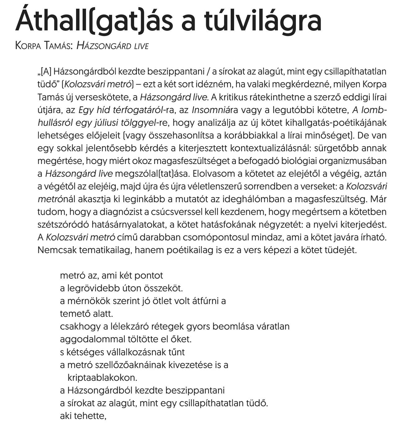 Korpa Tamás Házsongárd live című verseskötetéről Ágoston Enikő Anna írt kritikát az Alföld2023/2. számába. Teljes terjedelemben a nyomtatott Alföldben vagy a Szófán olvasható.