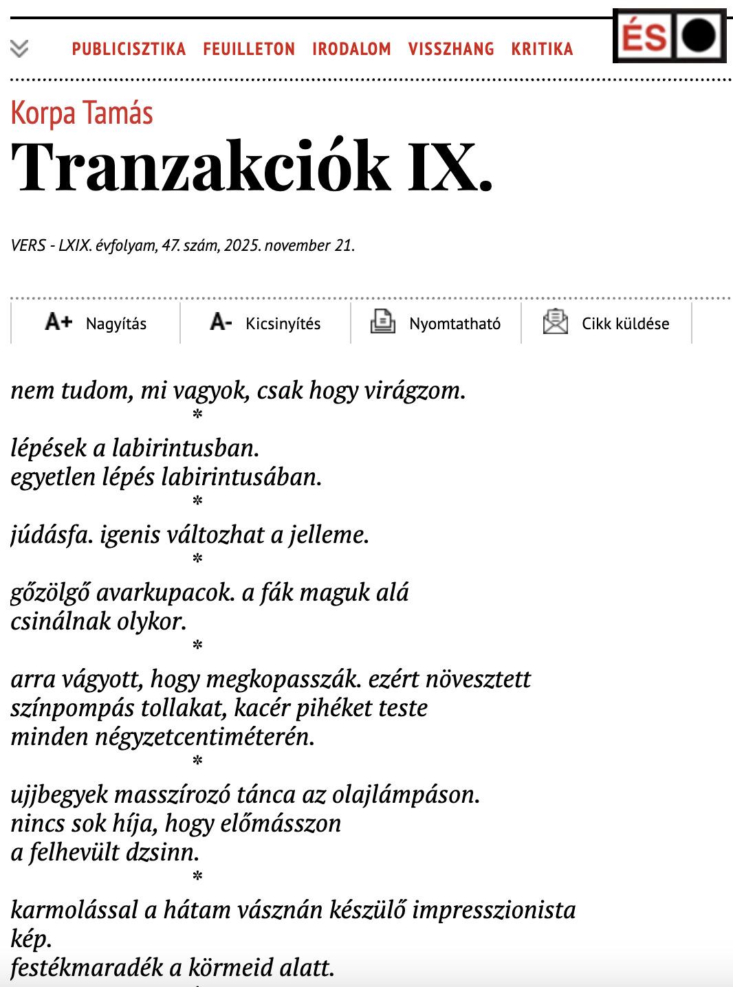 Korpa Tamás Tranzakciók IX. című verse az Élet és Irodalomban jelent meg. Teljes terjedelemben az ÉS online felületén olvasható.