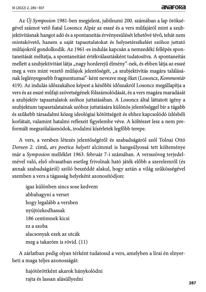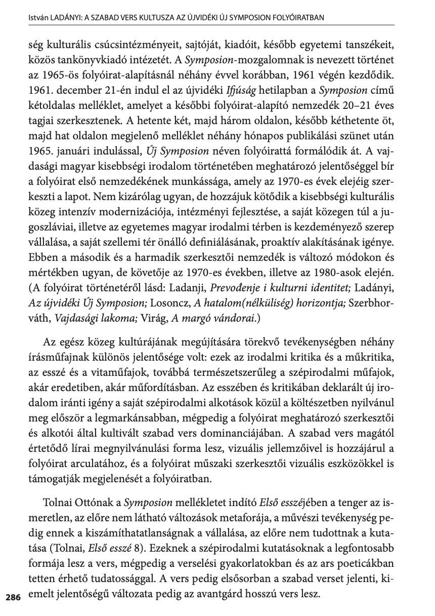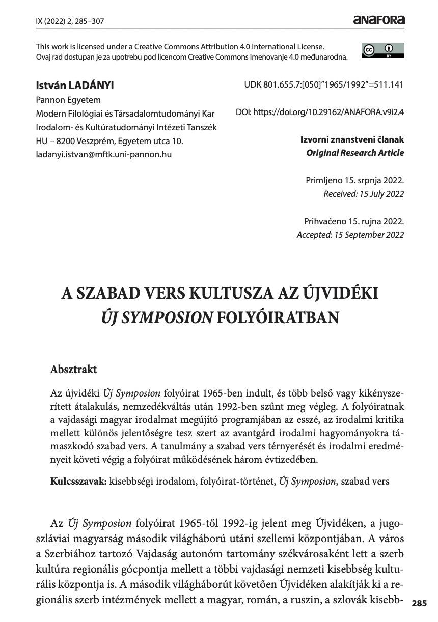 Ladányi István A szabad vers kultusza az újvidéki Új Symposion folyóiratban című tanulmánya az Anaforában, az Eszéki Egyetem lapjában jelent meg, ahol teljes terjedelemben olvasható.