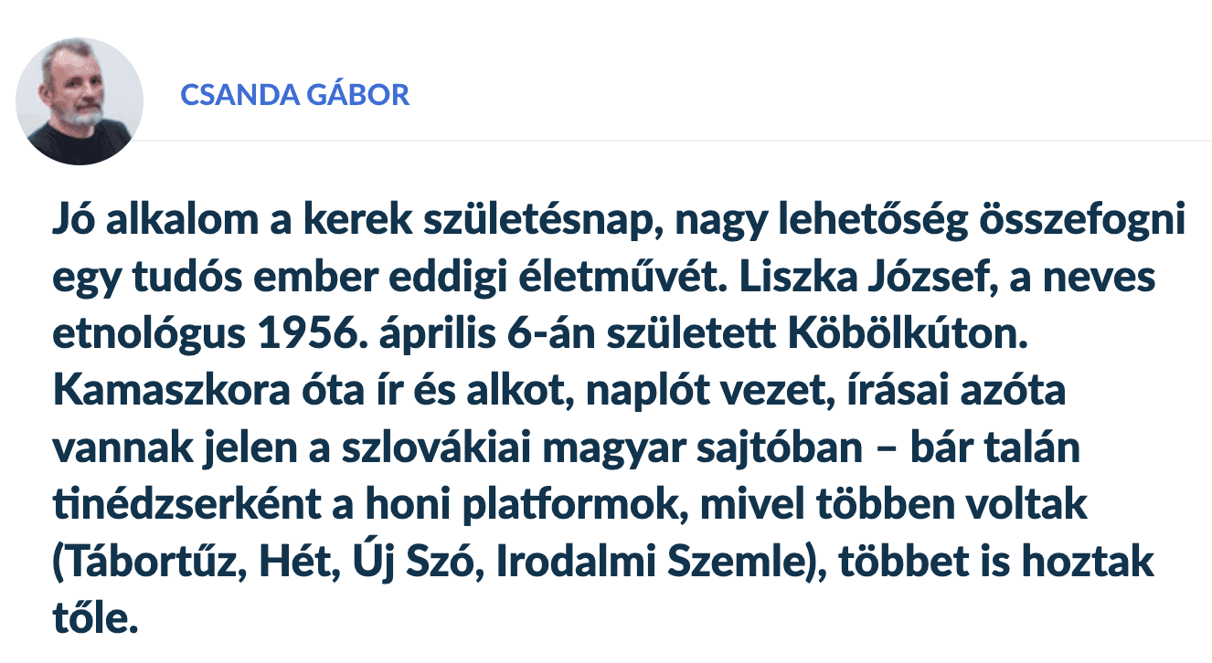 Csanda Gábor köszöntötte a 70 éves Liszka Józsefet az Új Szóban. A köszöntő írás teljes terjedelemben az Új Szó online felületén olvasható.