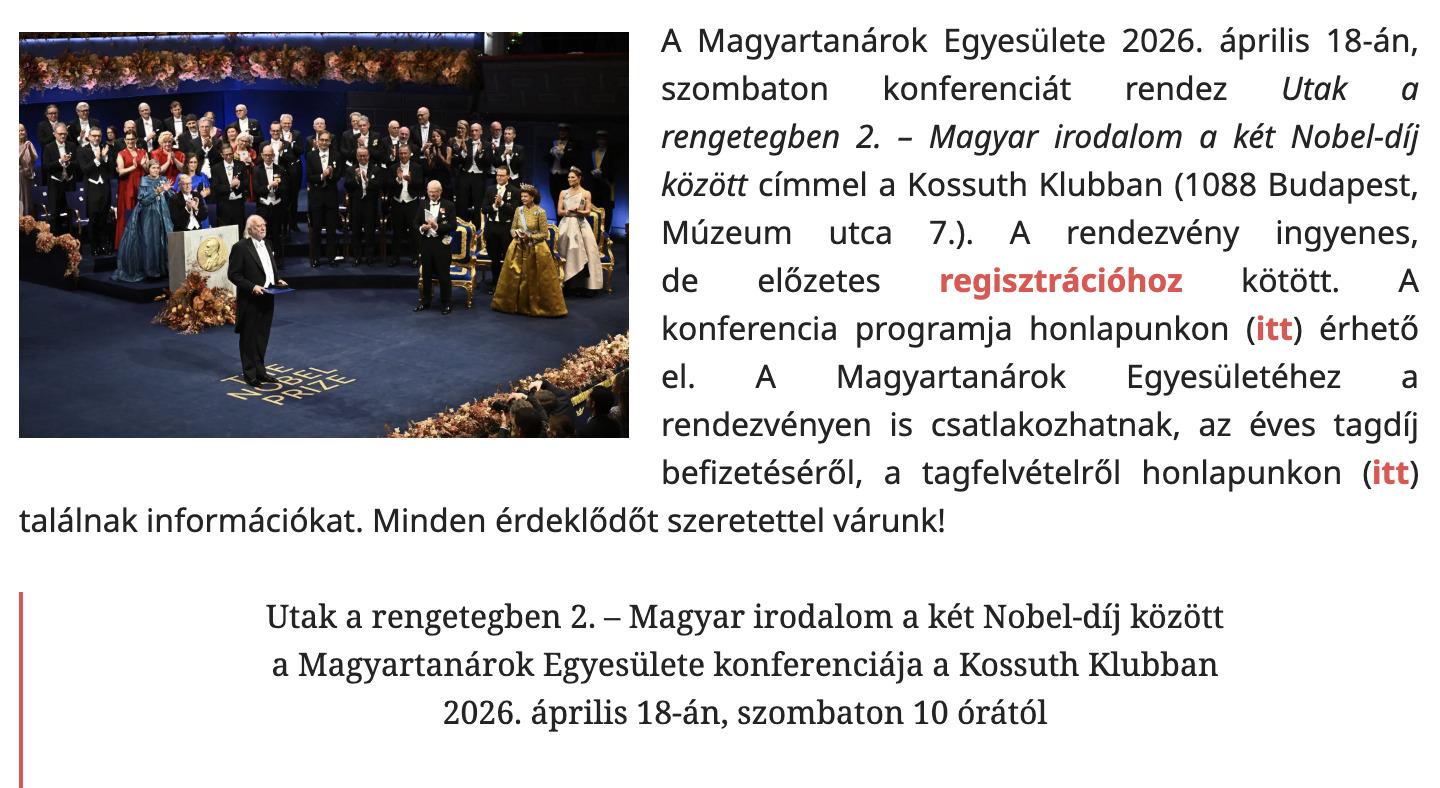 Csehy Zoltán is előad a Magyartanárok Egyesülete konferenciáján 2026. április 18-án. További információk a Magyartanárok Egyesülete honlapján olvashatók: