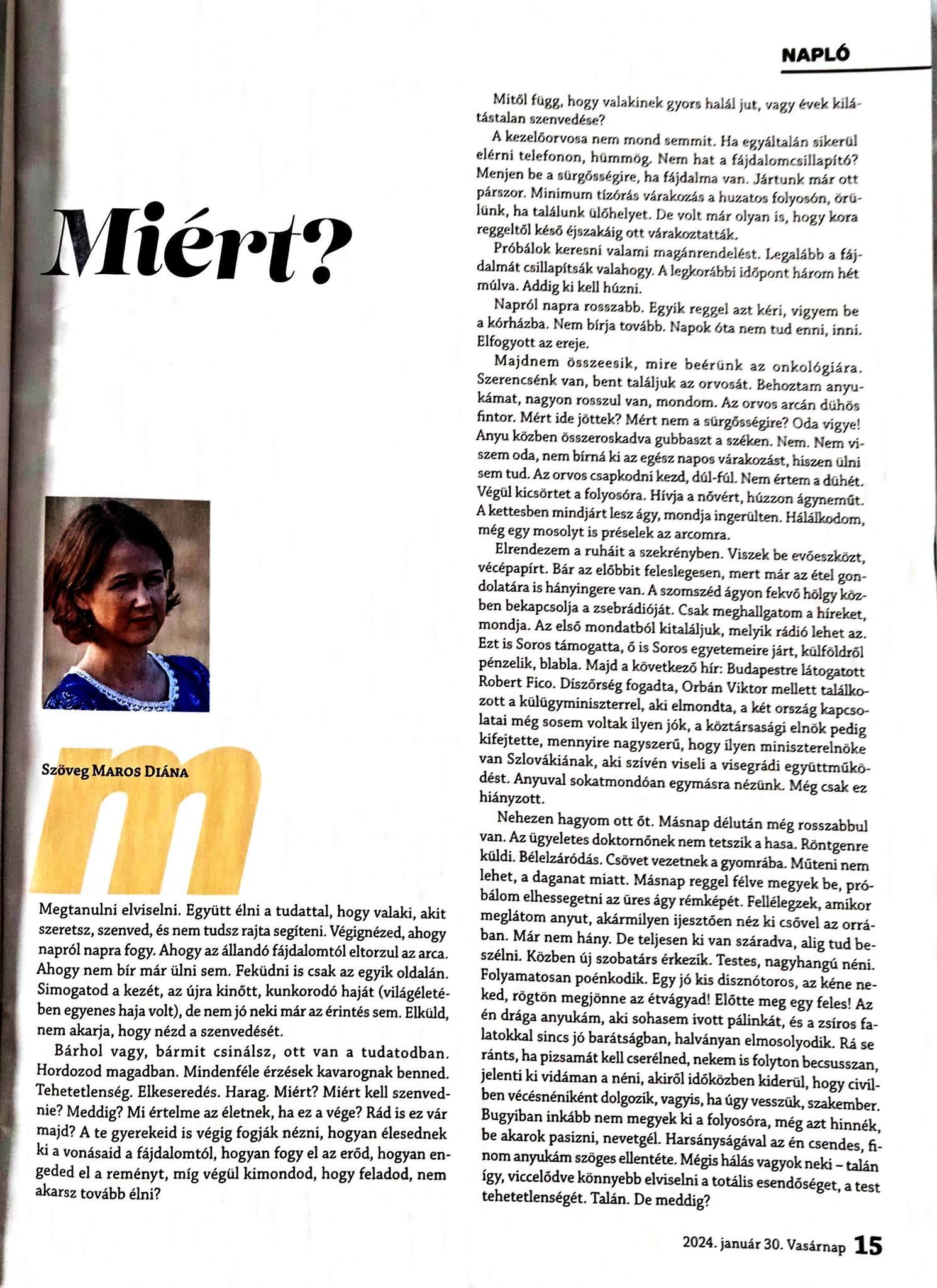 Maros Diána Miért? című írása a Vasárnapban jelent meg. Teljes terjedelemben a Vasárnap 2024. január 30-i számában olvasható.