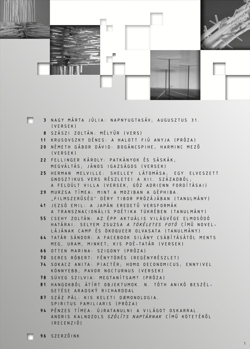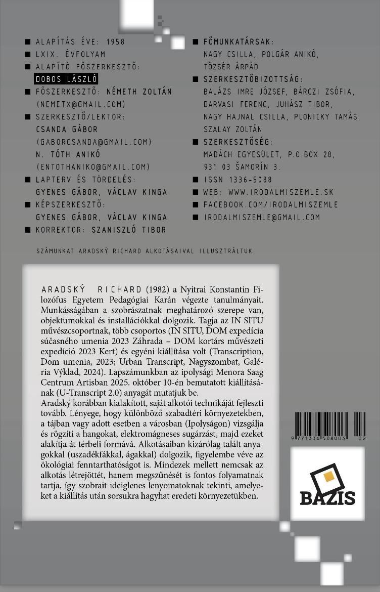 Az Irodalmi Szemle 2026 februári számában Nagy Márta Júlia, Szászi Zoltán, Németh Gábor Dávid, Fellinger Károly, Tatár Sándor, Sokacz Anita, valamint Góz Adrienn fordításában Herman Melville verseit, illetve Krusovszky Dénes, Otten Marina, Seres Róbert és Süveg Szilvia prózáját olvashatjuk. Folytatódik Száz Pál Kis Keleti Dæmonologia című tárcasorozata, a februári számban a Spiritus Familiaris című résszel. Murzsa Tímea Déry Tibor prózájának filmszerűségéről, Csehy Zoltán Selyem Zsuzsa A tökéletes fotó című novellájának camp és ökoqueer olvasatáról közöl tanulmányt, valamint tanulmánnyal jelentkezik a komáromi Selye János Egyetem fiatal doktorandusza, Jezsó Emil is, aki a japán eredetű versformák transznacionális poétikájáról értekezik. N. Tóth Anikó Aradský Richárddal ipolysági kiállítása kapcsán készített interjút, Pénzes Tímea pedig Andris Kalnozols Szólíts Naptárnak című kötetéről írt recenziót. A lapszámot Aradský Richárd U-TRANSCRIPTION 2.0 című ipolysági kiállításának alkotásai illusztrálják.