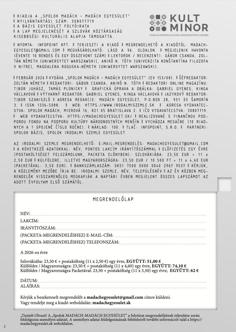 Az Irodalmi Szemle nyomtatott változata a 2026-os évre megrendelhető a következő e-mail-címen: madachegyesulet@gmail.com.