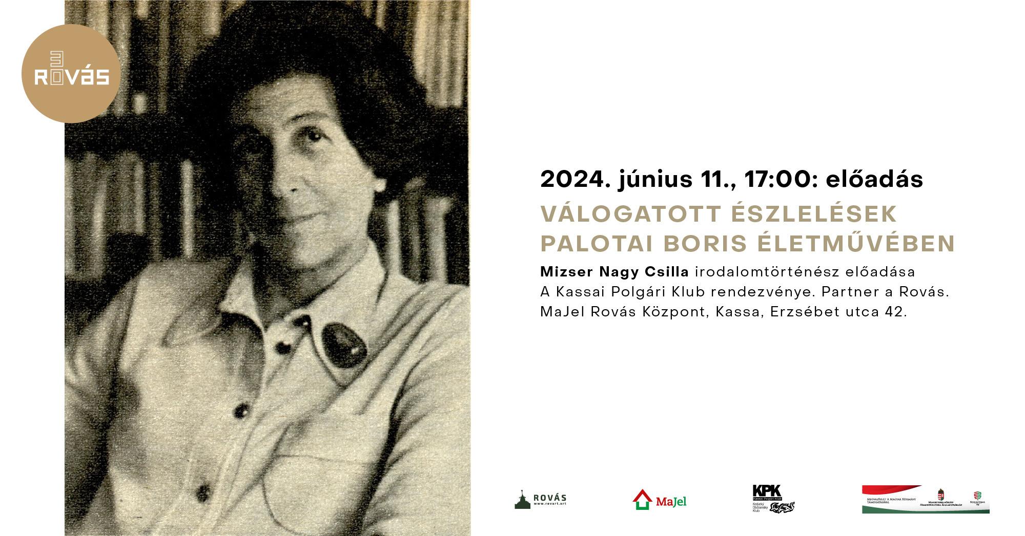 Mizser Nagy Csilla tart előadást Palotai Boris életművéről Kassán, a Kassai Polgári Klub rendezésében, a MaJel Rovás Központban (Erzsébet utca 42.) 2024. június 11-én 17.00-kor.