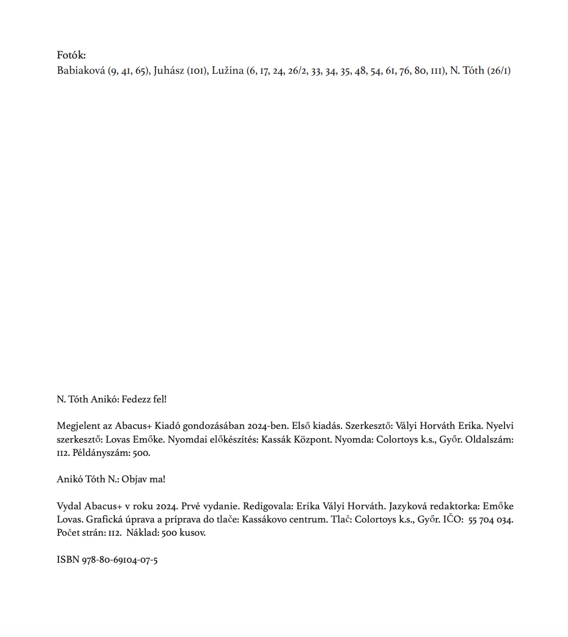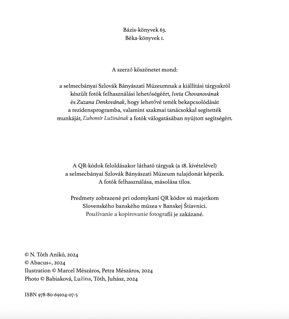N. Tóth Anikó Fedezz fel! Kalandok a selmecbányai Szlovák Bányászati Múzeumban című múzeumi mesekönyve megjelent az Abacus+ Kiadó gondozásában a Bázis-könyvek 63. darabjaként. Felelős kiadó: Juhász R. József. Borító: Gyenes Gábor. Szerkesztette: Vályi Horváth Erika. Nyelvi szerkesztő: Lovas Emőke.