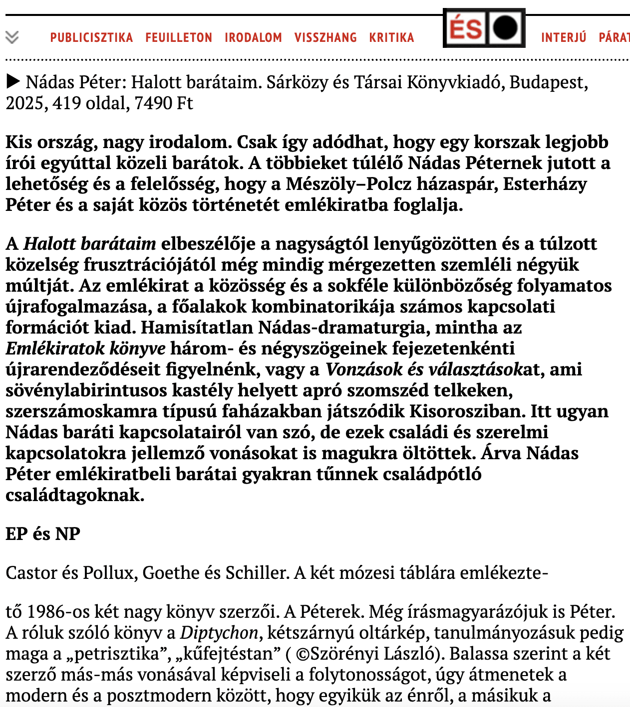 Nádas Péter Halott barátaim című könyvéről Szolláth Dávid írt az Élet és Irodalomban. Teljes terjedelemben az ÉS online felületén olvasható: https://www.es.hu/cikk/2026-03-20/szollath-david/emlekirat-es-csaladregeny-az-es-konyve-marciusban.html.