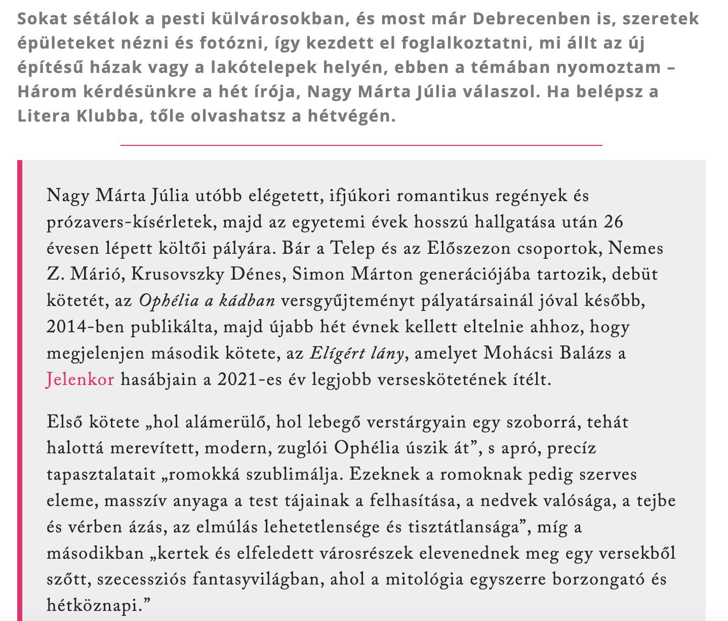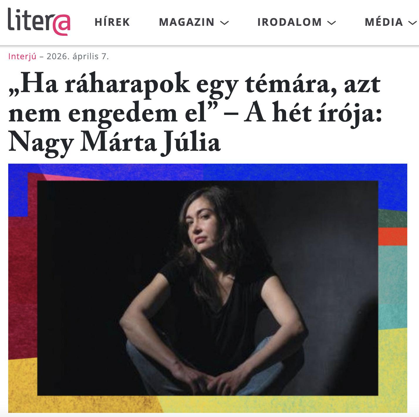 Nagy Márta Júlia A hét írója a Literán! Ennek kapcsán a Litera szerkesztői bemutatták Nagy Márta Júlia eddigi pályáját, illetve három kérdést tettek fel, amelyre válaszolt. A hét írója összeállítás Nagy Márta Júliával teljes terjedelemben a Literán olvasható.