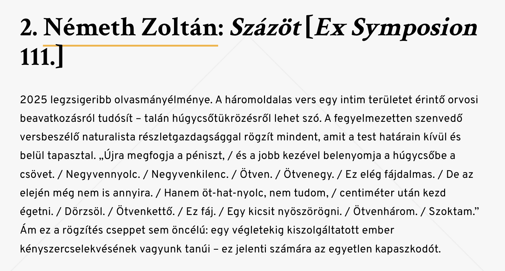 Németh Zoltán Százöt és Peer Krisztián Naphimnusz című verse a KULTER 2025-ös TOP10 KULTkölteményei közé került, Szőcs Petra A cseléd energiája című verse pedig a 25-ös listára! Gratulálunk Németh Zoltánnak, Peer Krisztiánnak és Szőcs Petrának, a Bázis tagjainak! Az összefoglalót Purosz Leonidasz készítette, teljes terjedelemben a KULTER online felületén olvasható.