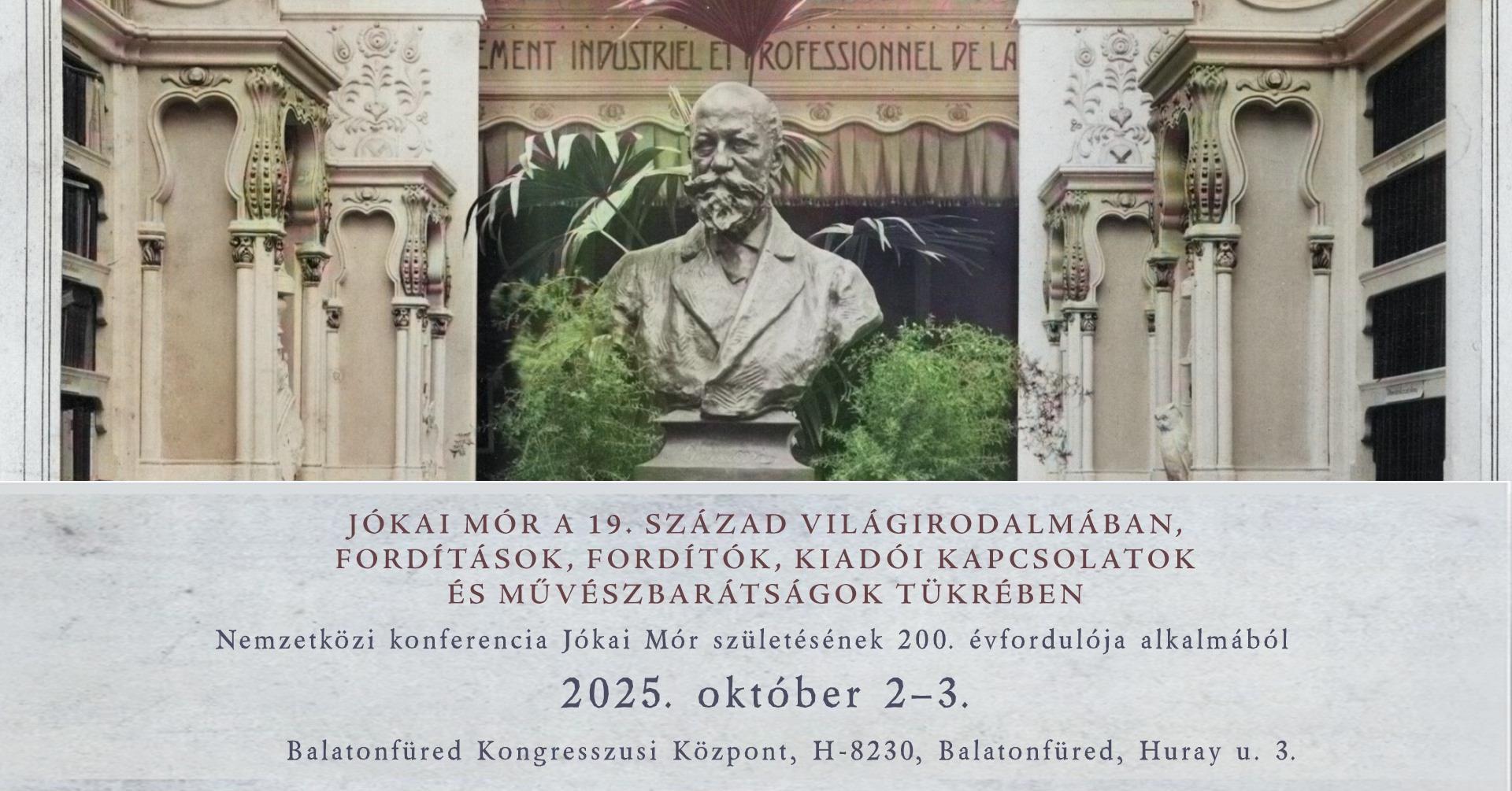 "Az ELTE Humán Tudományok Kutatóközpontja Irodalomtudományi Intézetének Jókai 200: Jókai Mór Összes Művei kritikai kiadásának bicentenáriumi munkálatai OTKA kutatócsoportja, az SZTE Irodalom és Kultúratudományi Doktori Iskolája és a Tempevölgy folyóirat tudományos tanácskozást rendez 2025. október 2–3-án „Jokai, Maurus (1825−1904), ungar. Romanschriftsteller; Schwarze Diamanten”: Jókai Mór a 19. század világirodalmában, fordítások, fordítók, kiadói kapcsolatok és művészbarátságok tükrében címmel Balatonfüreden.