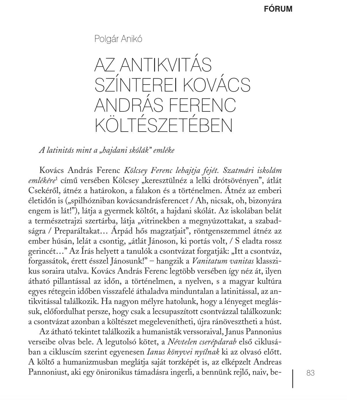 Polgár Anikó Az antikvitás színterei Kovács András Ferenc költészetében című tanulmánya a Látó 2025/12. számában jelent meg. Teljes terjedelemben a Szófán vagy a nyomtatott Látóban olvasható.